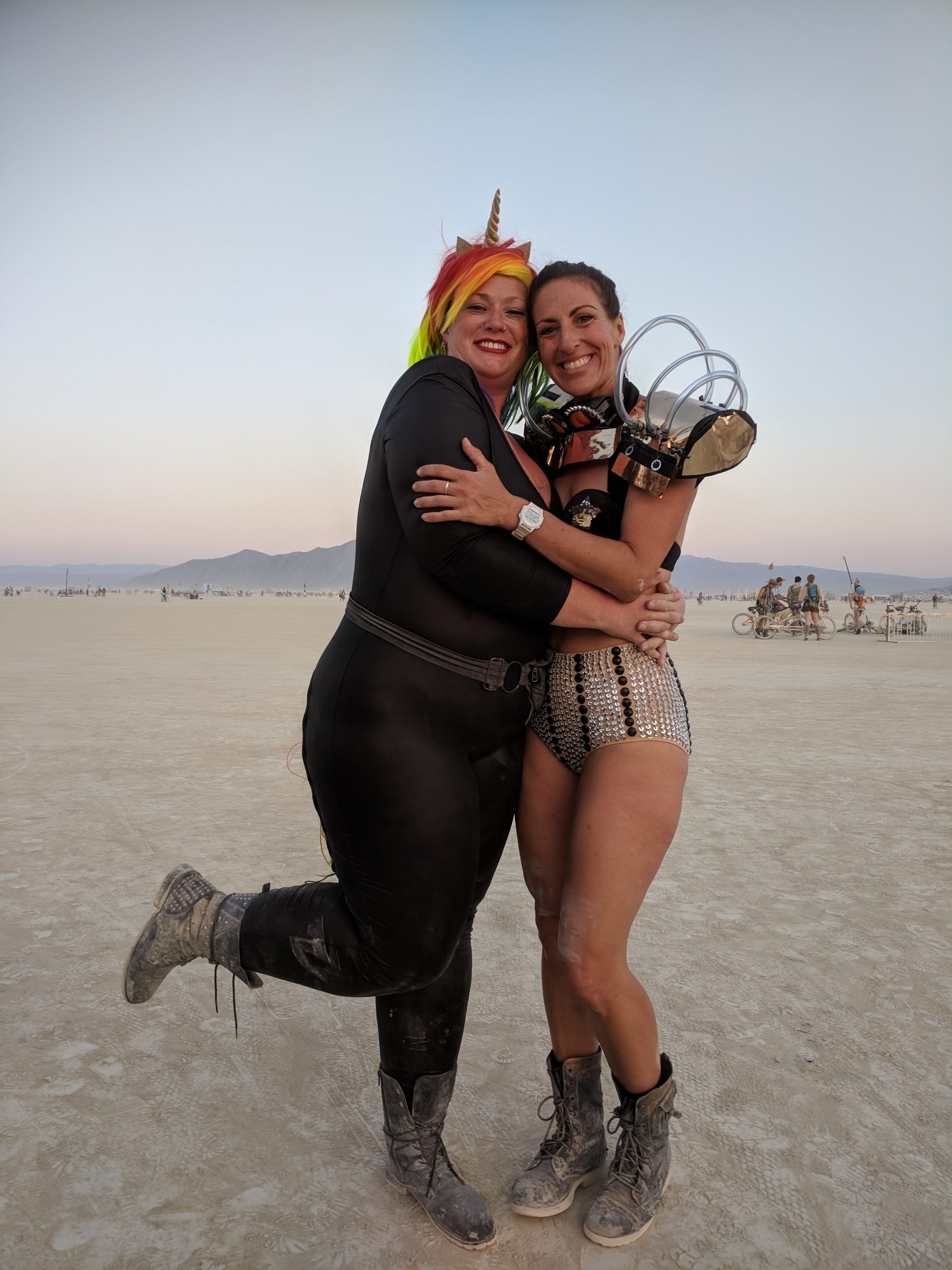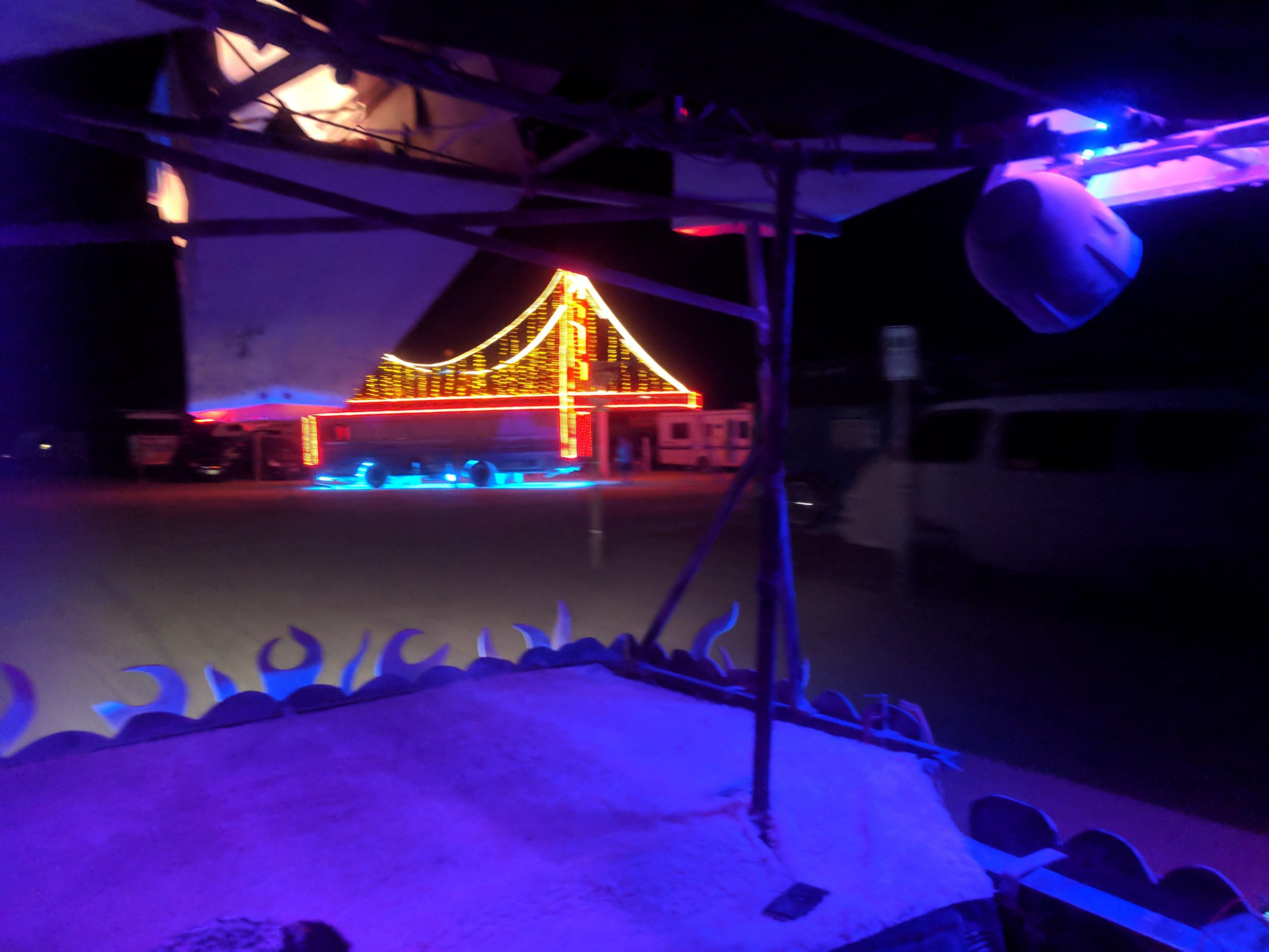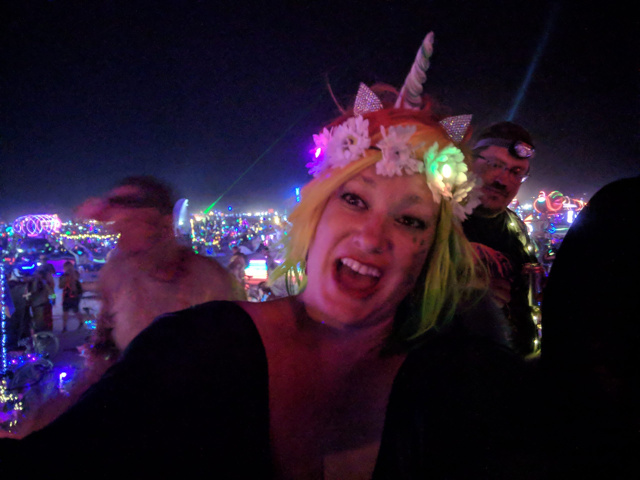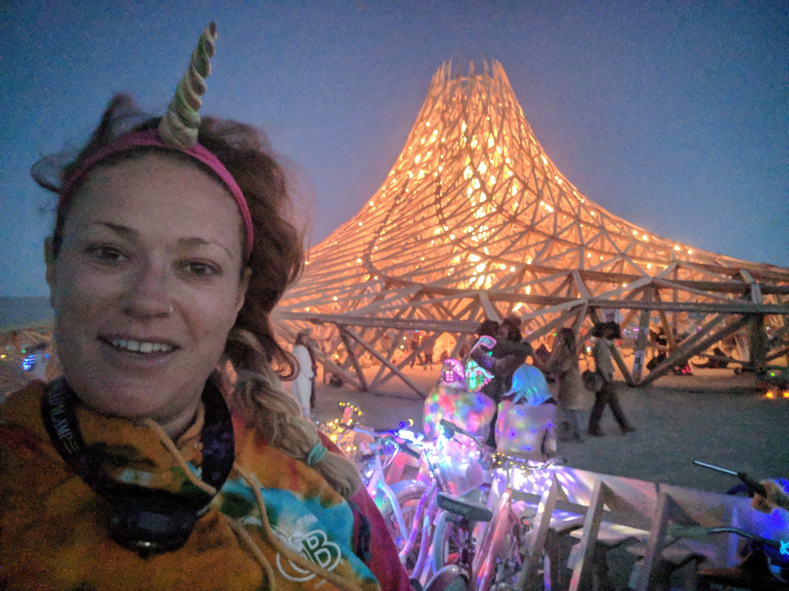 While not a fan of the burn’s EDM music, by far the strongest influence of those offered, many other types that I did like could be found in the nooks and crannies. Case in point, the aforementioned classical and unexpected moments such as riding up upon a man adorned in a pegasus hat and yogi pants while singing opera at a skill level that made me think he must be professional. One of those surprise sidetracked moments on my way to get glow-in-the-dark henna Wednesday afternoon. An outing that also included a sunset wedding on top of a motorhome and new friends who came back to Spanky’s a few hours later.