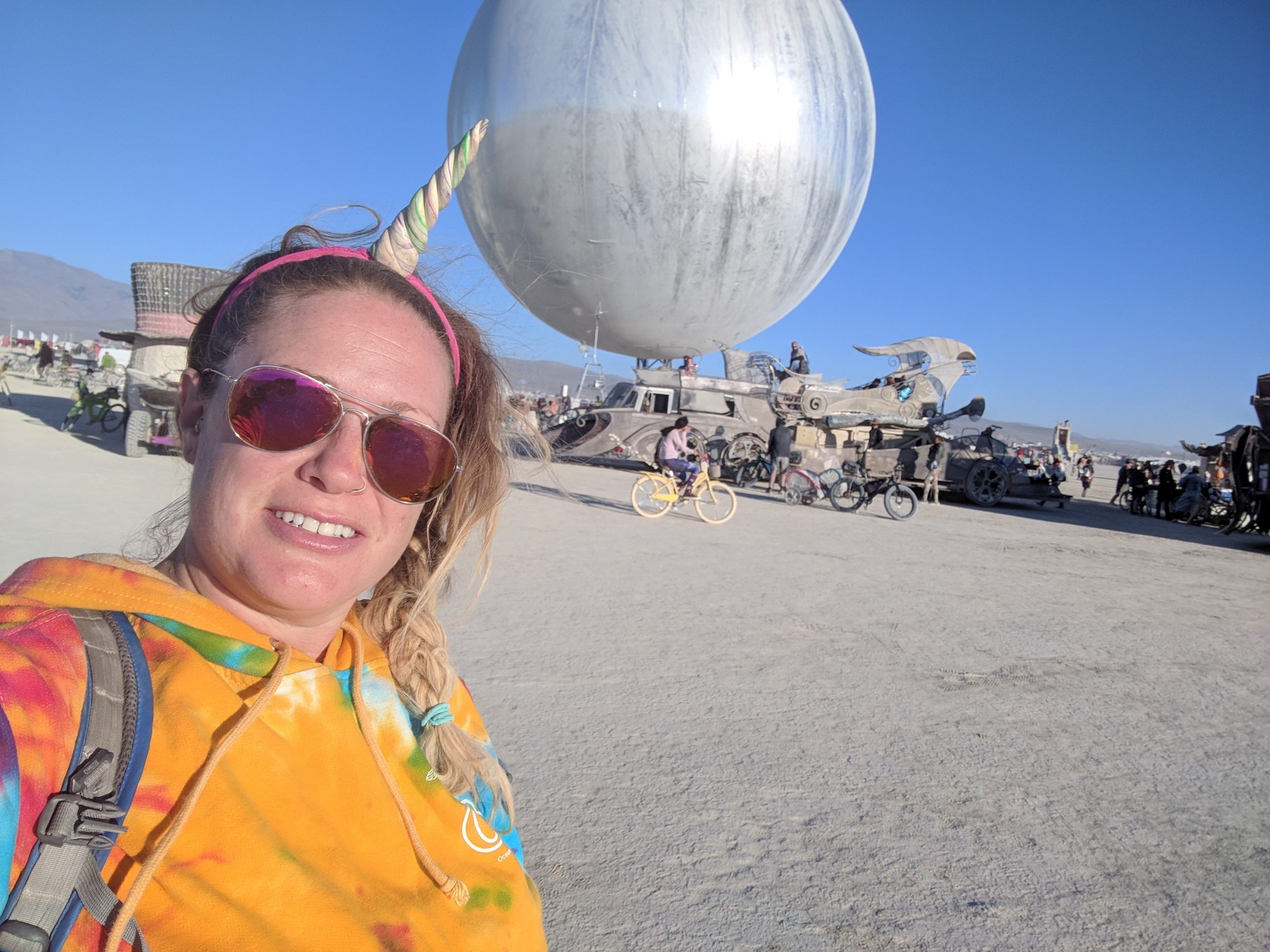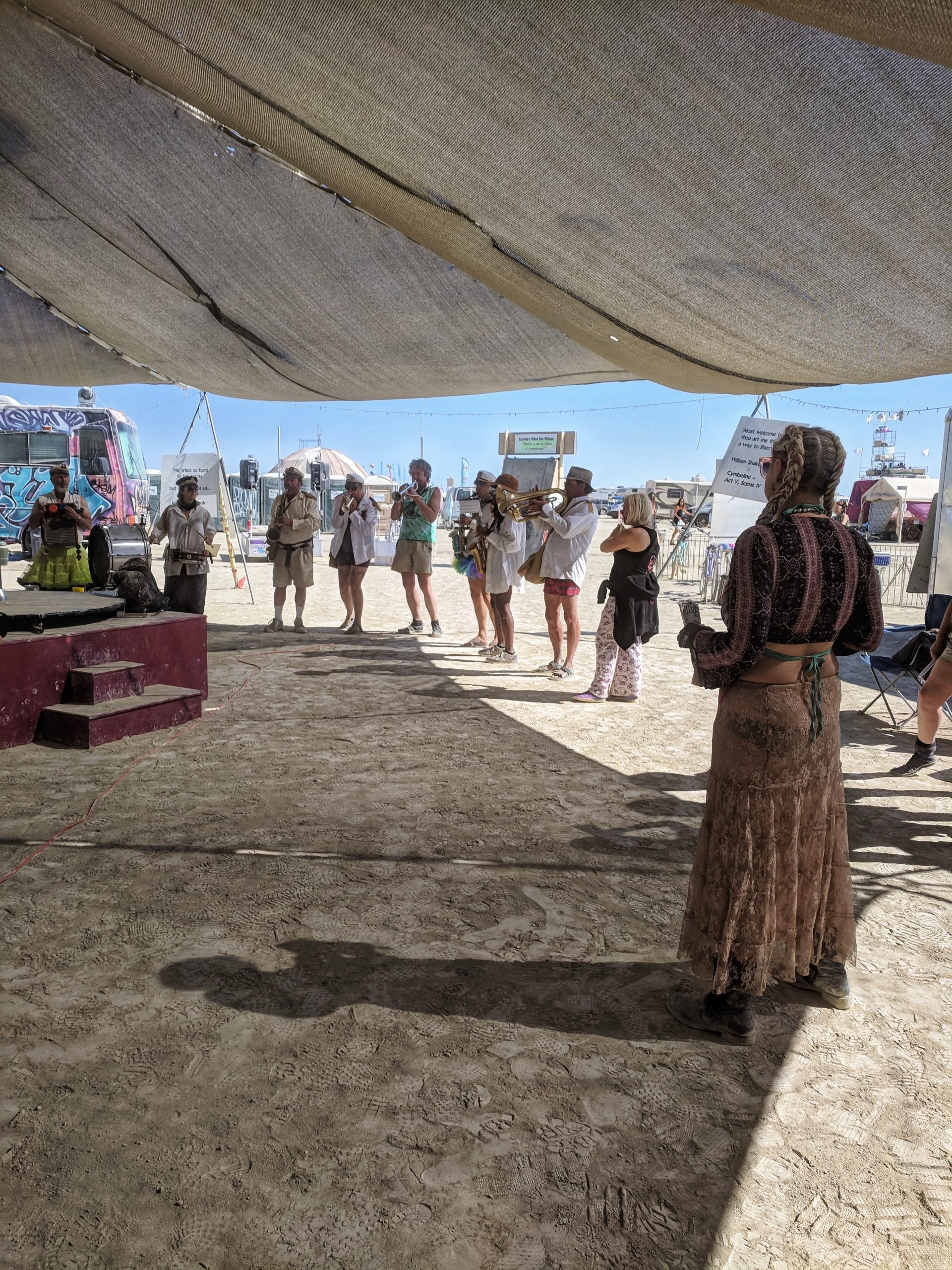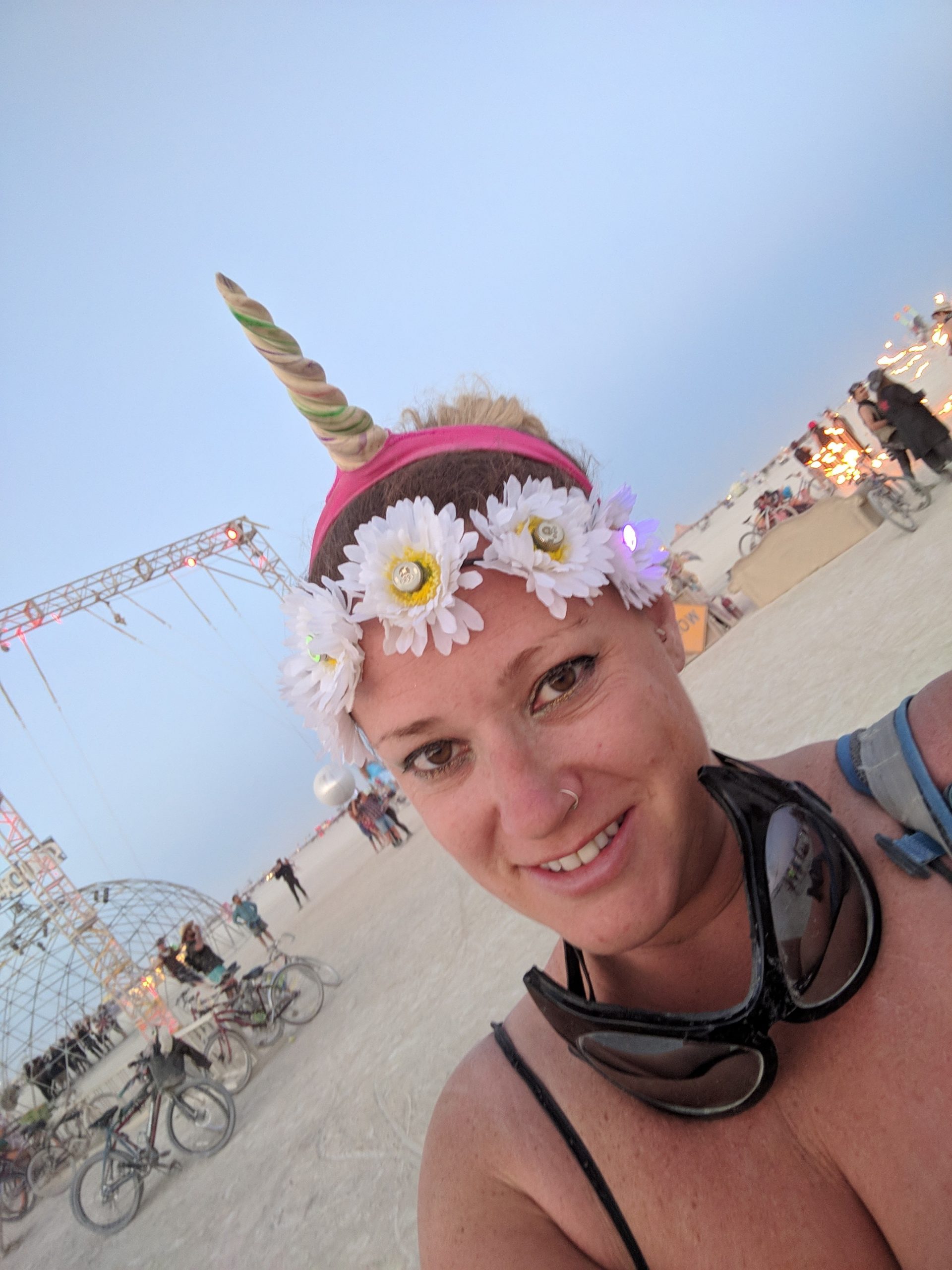 While not a fan of the burn’s EDM music, by far the strongest influence of those offered, many other types that I did like could be found in the nooks and crannies. Case in point, the aforementioned classical and unexpected moments such as riding up upon a man adorned in a pegasus hat and yogi pants while singing opera at a skill level that made me think he must be professional. One of those surprise sidetracked moments on my way to get glow-in-the-dark henna Wednesday afternoon. An outing that also included a sunset wedding on top of a motorhome and new friends who came back to Spanky’s a few hours later.