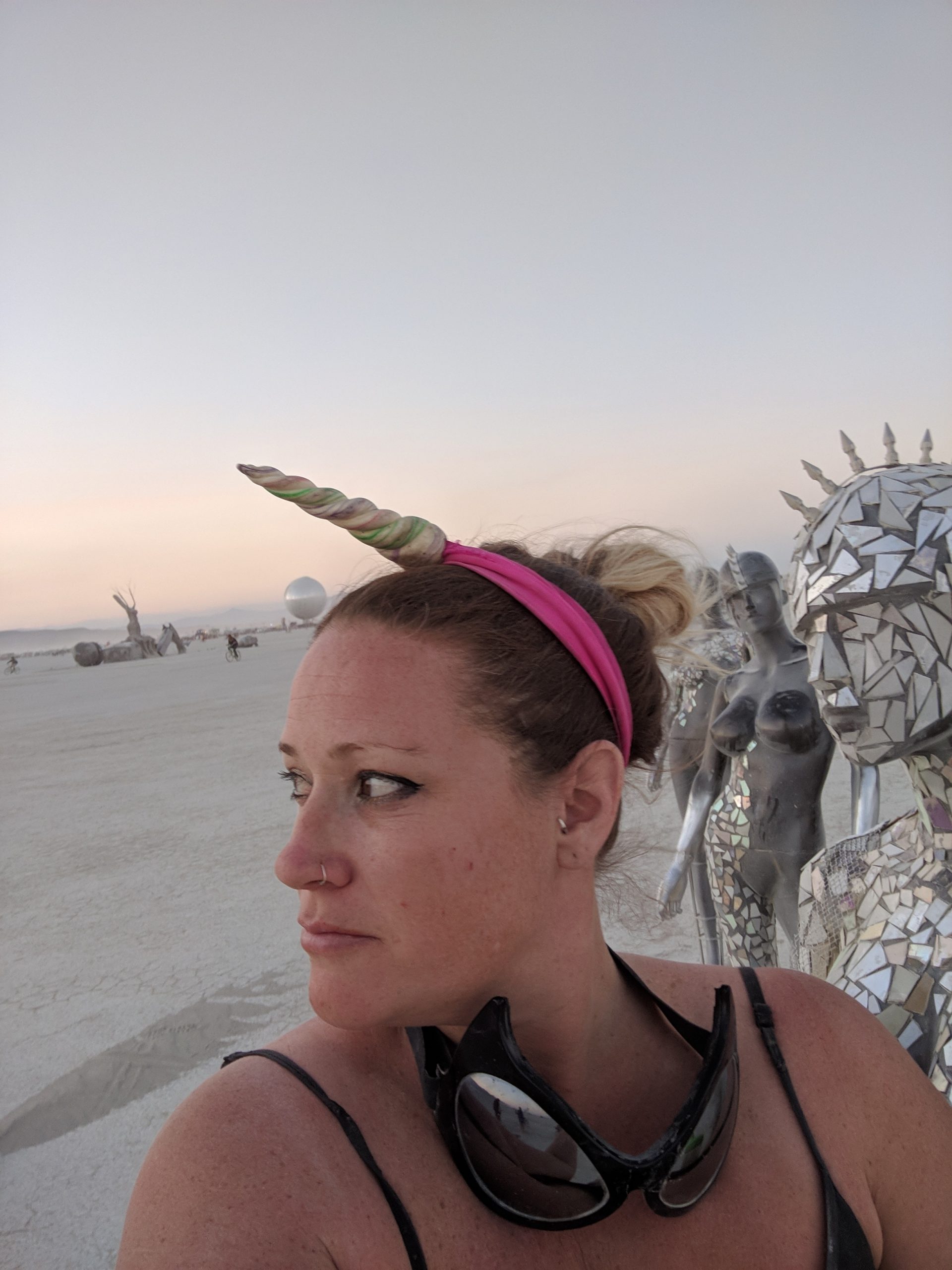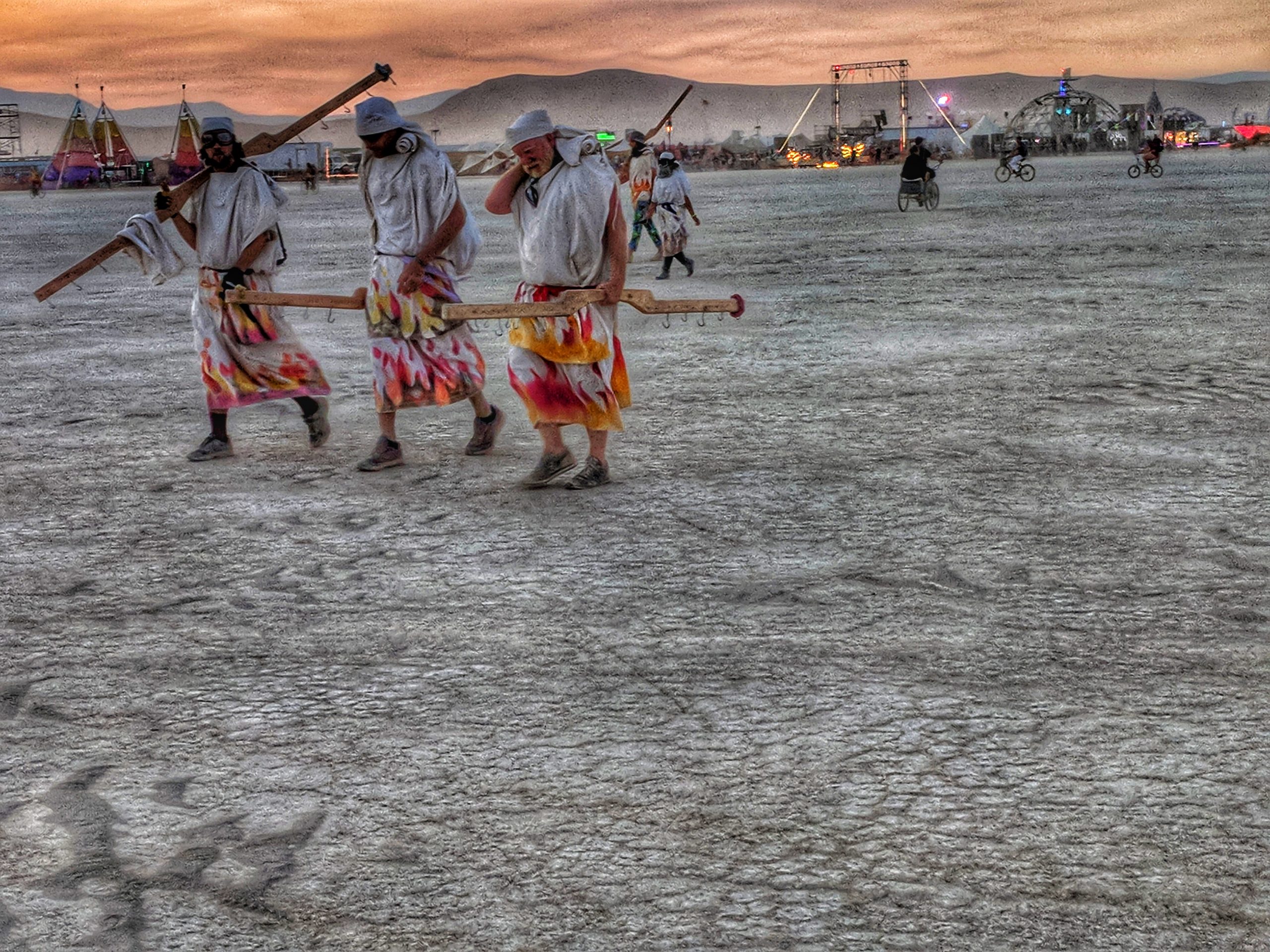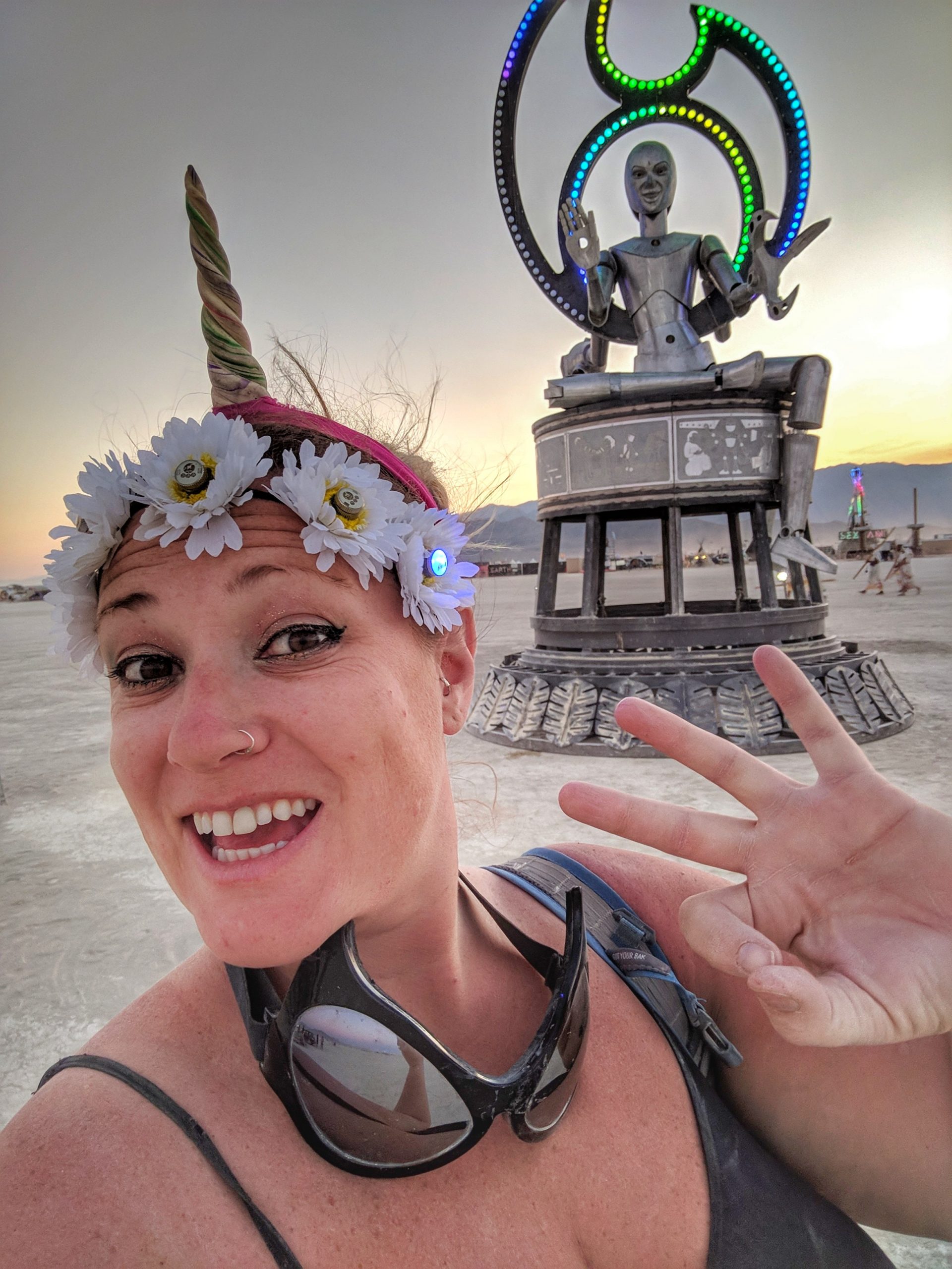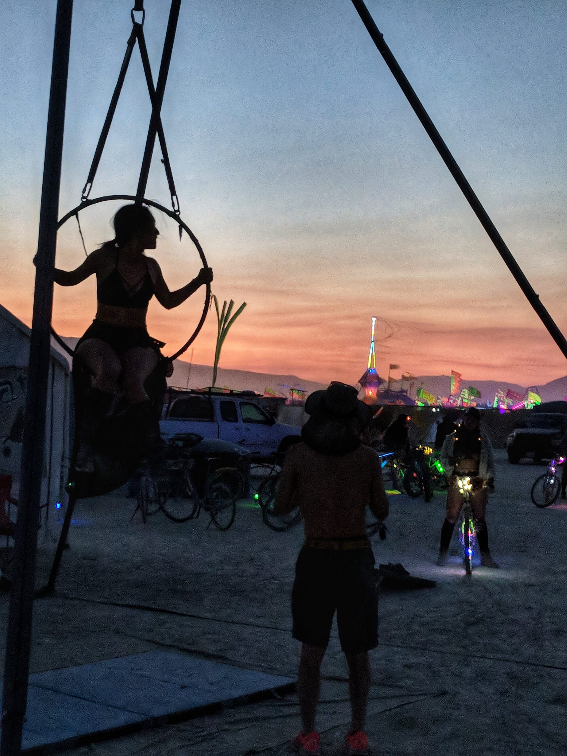 Thursday was usually my crash day but I had already got that out of the way so my day was opened up to doing something on my burner bucket list a bit to the opposite end of the spectrum. Instead of staying up all night to see the mythical sunrise, I woke up an hour before in order to have the experience sober and with (still a very small amount of) sleep. Biking out to the dimly-lit temple in the dark chill of that desert night, I walked around looking at the hand-written letters and other tributes hung in the structure that were often made out to recently deceased loved ones (the doggo ones got me the most), observed the people in there and checked in with what was happening to me at that moment in the most spiritual place of my universe. Outside was more musicians playing impromptu, this time in the style of soft singer-songwriter, and watched someone dressed as a Chinese Death Warrior walking around while stopping to stare at the rising sun. Biking farther into deep playa in a semi-agro-semi-curious search of the sound camp that had been shaking the entire city during all hours, I stopped first when stumbling upon a sunrise wedding and then continued on, finding it with what looked like spaceships outside and a kind of meditative chanting session beginning inside. From there I headed back to camp for the attempt of a nap, stopping along the way to check out the man and other art. Later was the Swan’s music session where I experienced one of the most impactful moments for the year when watching a woman who appeared to be from Ireland or Scotland and was emotionally being reminded of some kind of big memory. It was fun to be able to be in the middle of the music instead of staring at the backs of others while bartending but it wasn’t so fun to bust out about half way through with an allergic reaction to all the dust that was being kicked up directly into my face thanks to the rugs of previous years being MIA during the obligatory jig-dancing and stomping with the music. Que a Benadryl daze and the third of the four times my body went down.