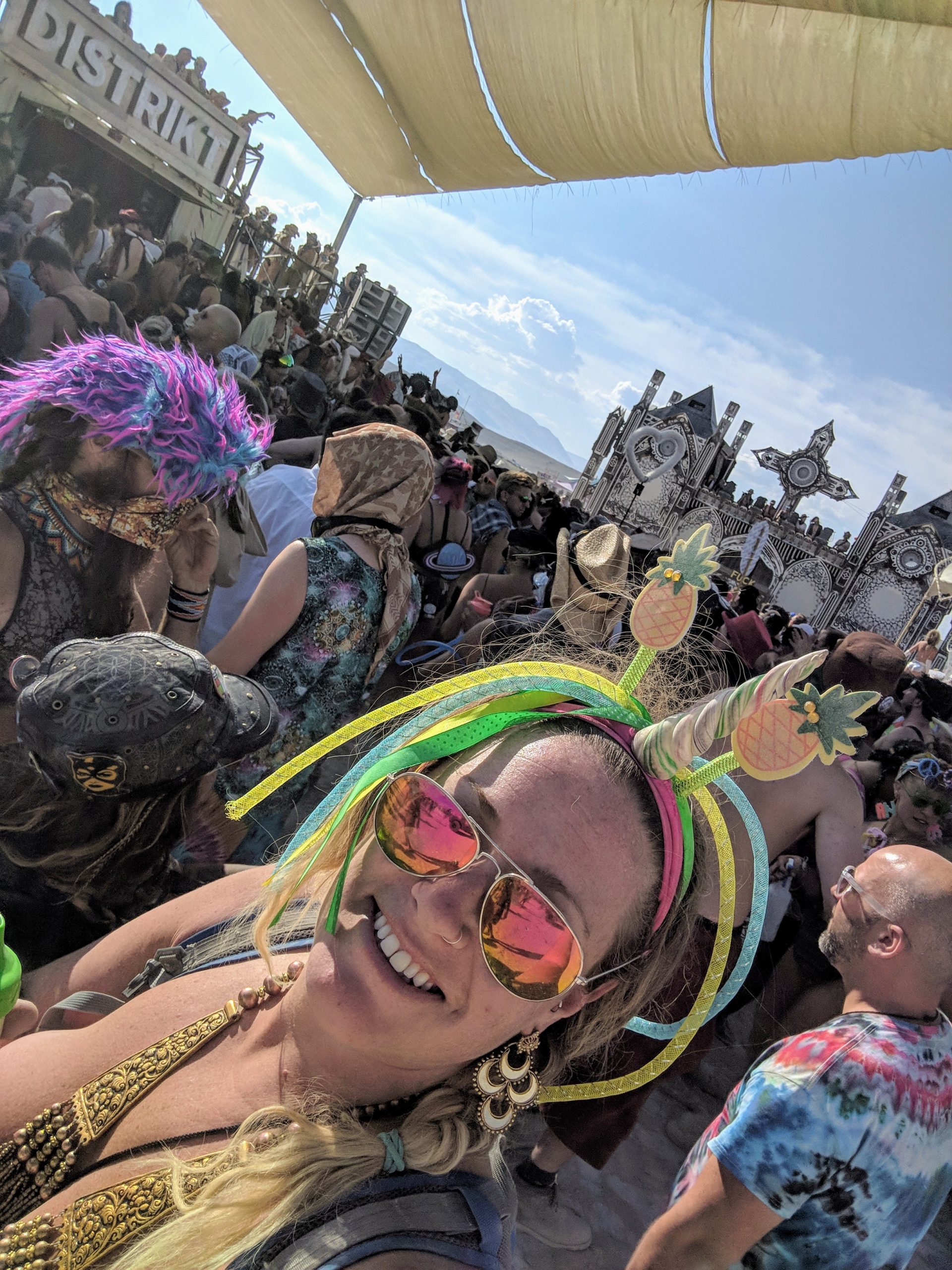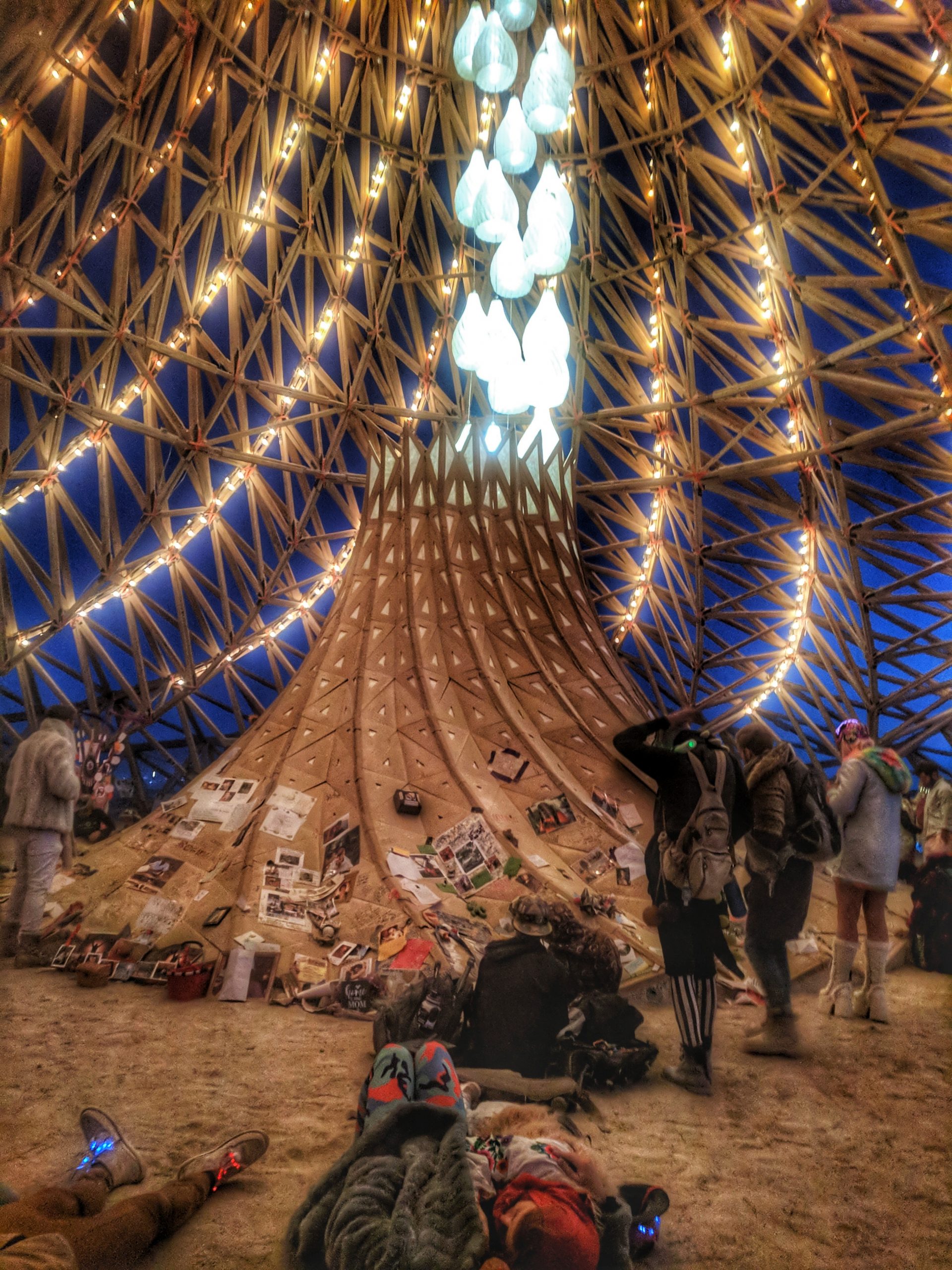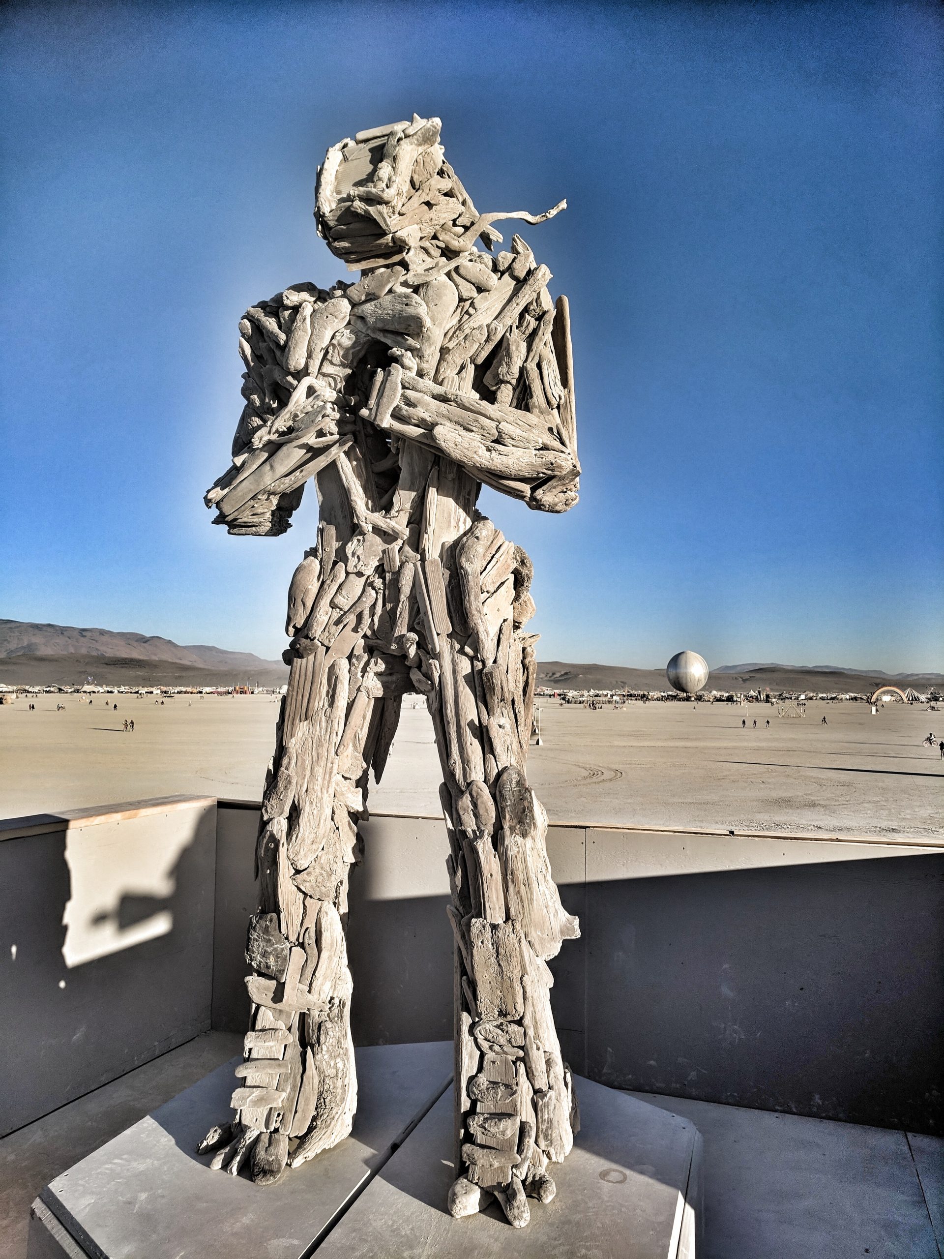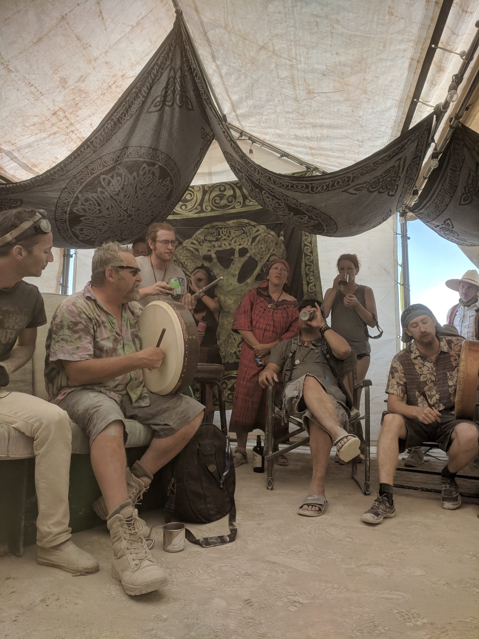 Thursday was usually my crash day but I had already got that out of the way so my day was opened up to doing something on my burner bucket list a bit to the opposite end of the spectrum. Instead of staying up all night to see the mythical sunrise, I woke up an hour before in order to have the experience sober and with (still a very small amount of) sleep. Biking out to the dimly-lit temple in the dark chill of that desert night, I walked around looking at the hand-written letters and other tributes hung in the structure that were often made out to recently deceased loved ones (the doggo ones got me the most), observed the people in there and checked in with what was happening to me at that moment in the most spiritual place of my universe. Outside was more musicians playing impromptu, this time in the style of soft singer-songwriter, and watched someone dressed as a Chinese Death Warrior walking around while stopping to stare at the rising sun. Biking farther into deep playa in a semi-agro-semi-curious search of the sound camp that had been shaking the entire city during all hours, I stopped first when stumbling upon a sunrise wedding and then continued on, finding it with what looked like spaceships outside and a kind of meditative chanting session beginning inside. From there I headed back to camp for the attempt of a nap, stopping along the way to check out the man and other art. Later was the Swan’s music session where I experienced one of the most impactful moments for the year when watching a woman who appeared to be from Ireland or Scotland and was emotionally being reminded of some kind of big memory. It was fun to be able to be in the middle of the music instead of staring at the backs of others while bartending but it wasn’t so fun to bust out about half way through with an allergic reaction to all the dust that was being kicked up directly into my face thanks to the rugs of previous years being MIA during the obligatory jig-dancing and stomping with the music. Que a Benadryl daze and the third of the four times my body went down.