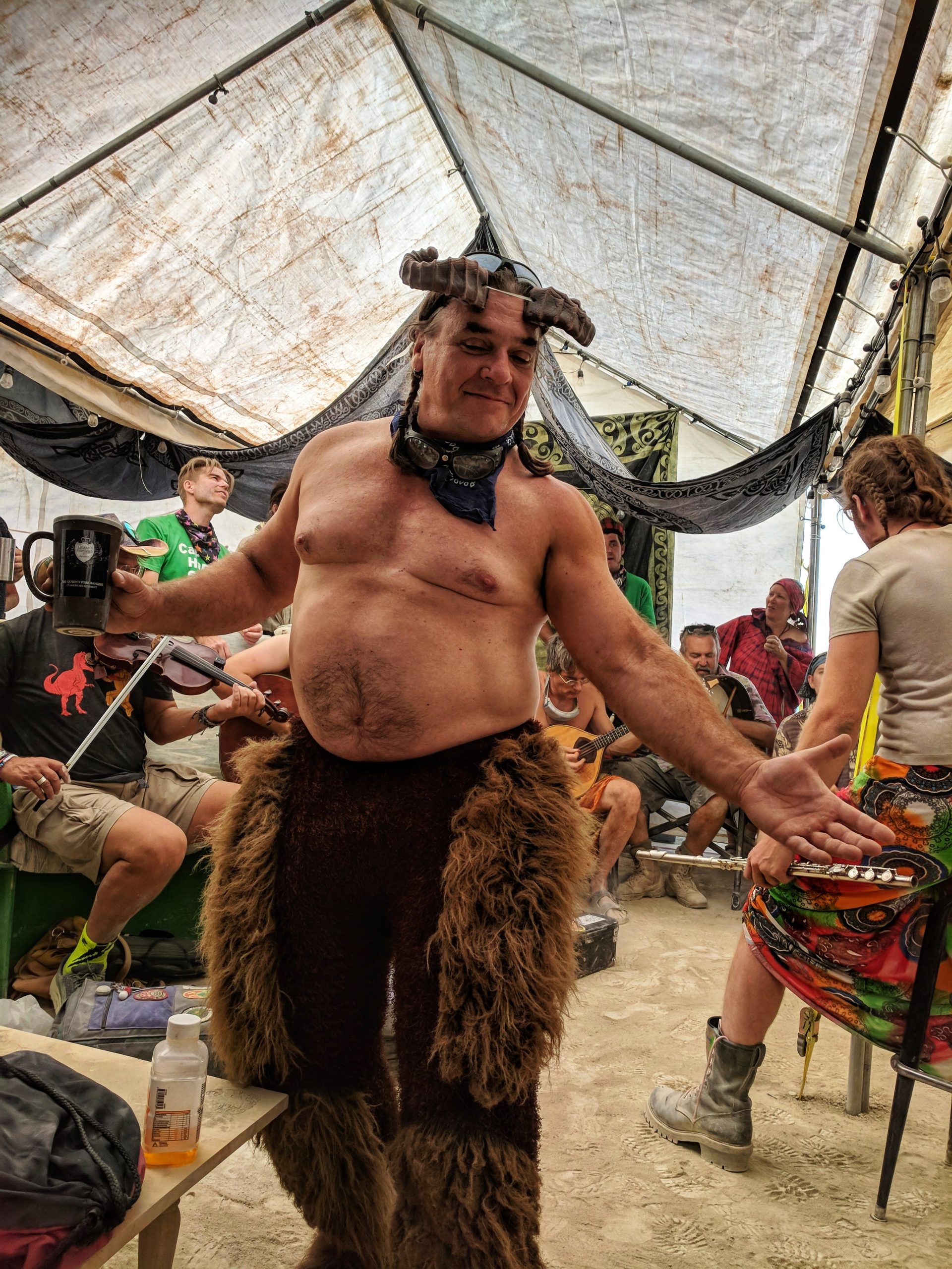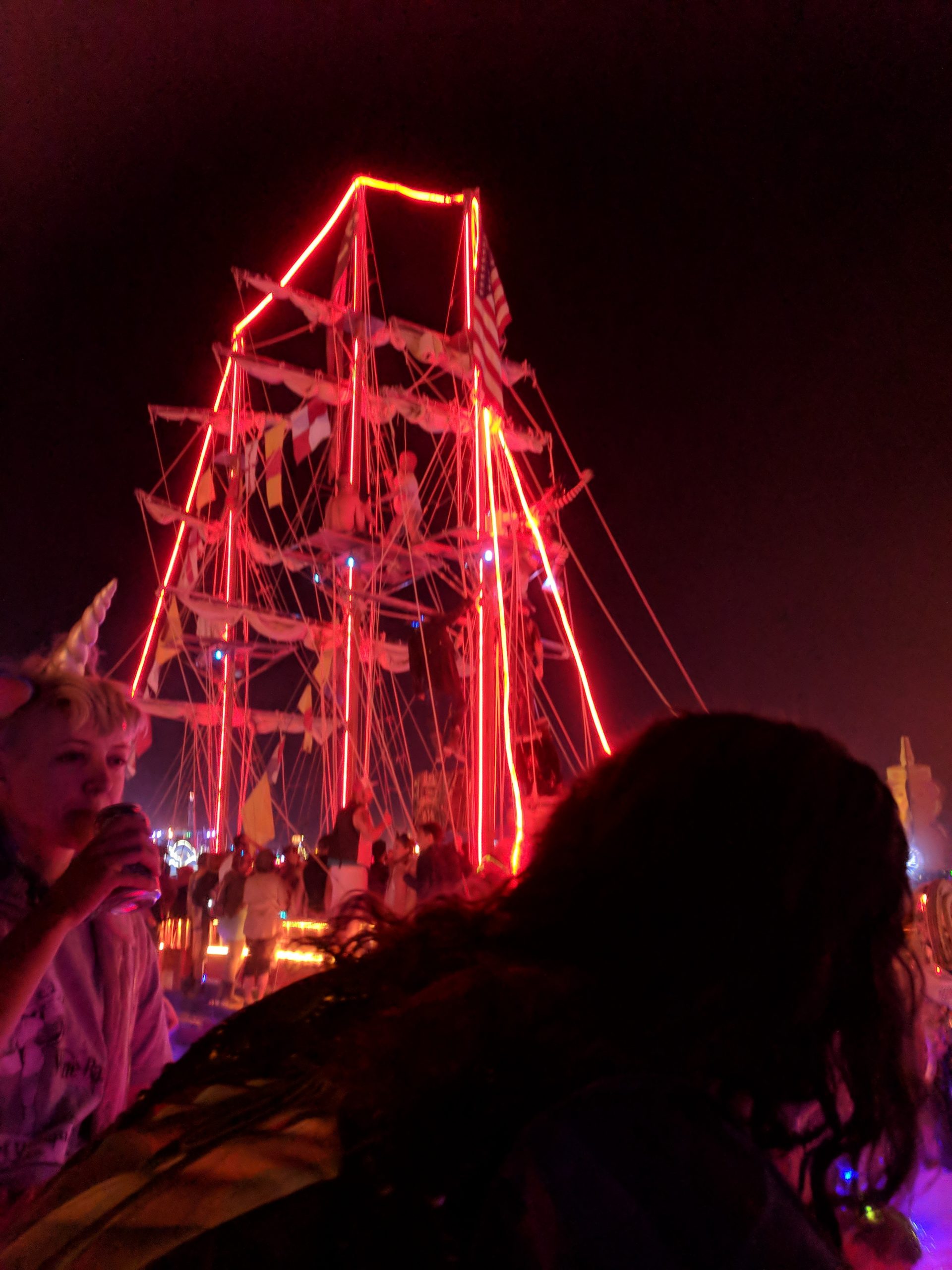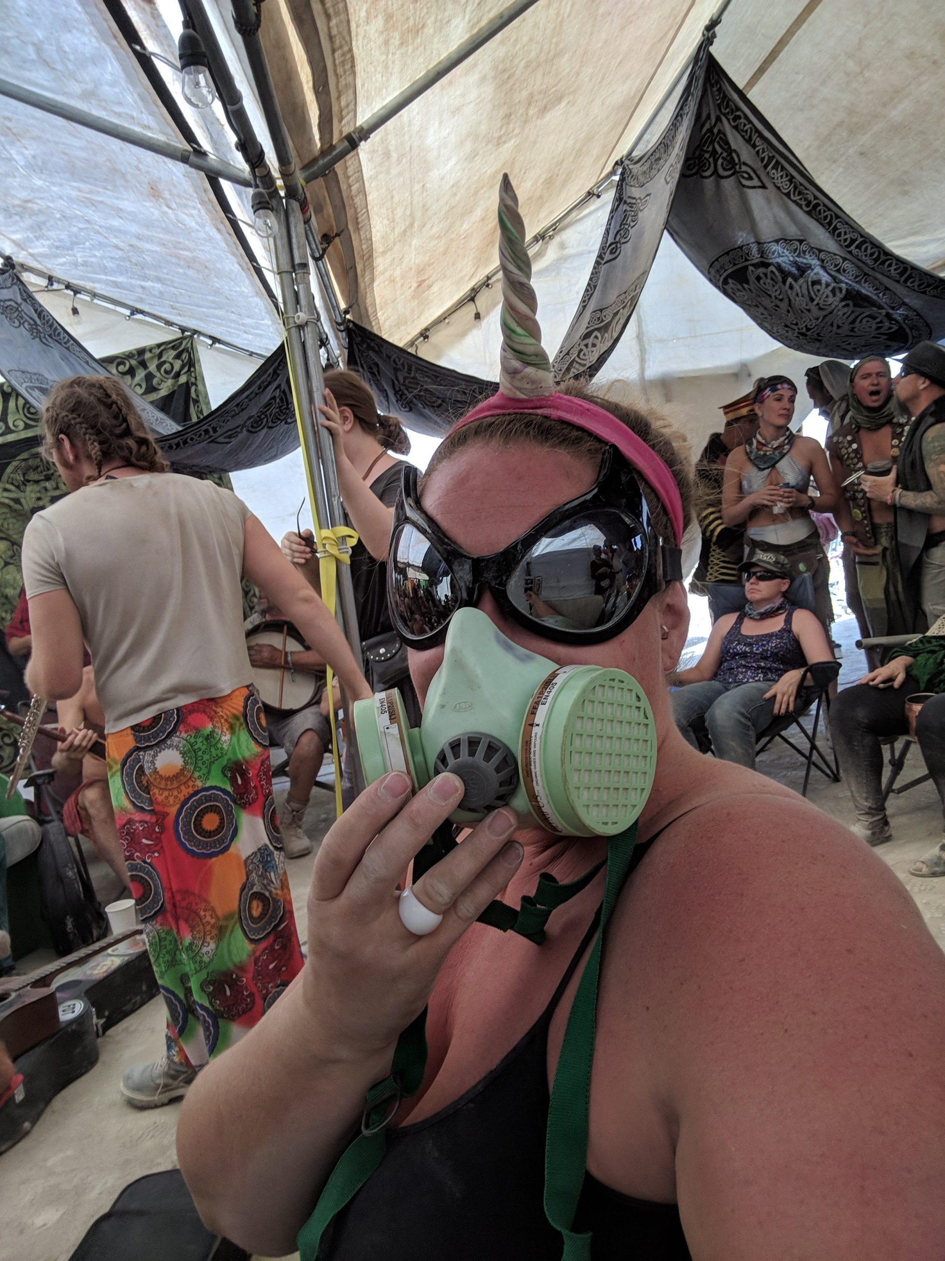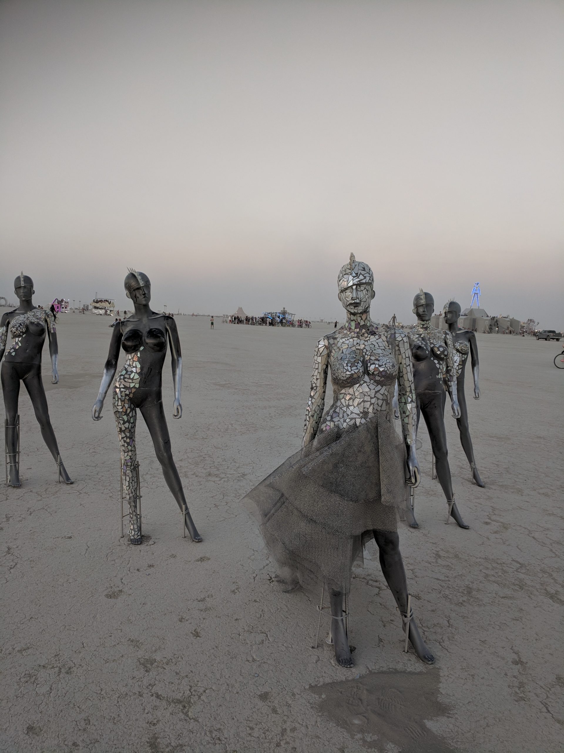 Thursday was usually my crash day but I had already got that out of the way so my day was opened up to doing something on my burner bucket list a bit to the opposite end of the spectrum. Instead of staying up all night to see the mythical sunrise, I woke up an hour before in order to have the experience sober and with (still a very small amount of) sleep. Biking out to the dimly-lit temple in the dark chill of that desert night, I walked around looking at the hand-written letters and other tributes hung in the structure that were often made out to recently deceased loved ones (the doggo ones got me the most), observed the people in there and checked in with what was happening to me at that moment in the most spiritual place of my universe. Outside was more musicians playing impromptu, this time in the style of soft singer-songwriter, and watched someone dressed as a Chinese Death Warrior walking around while stopping to stare at the rising sun. Biking farther into deep playa in a semi-agro-semi-curious search of the sound camp that had been shaking the entire city during all hours, I stopped first when stumbling upon a sunrise wedding and then continued on, finding it with what looked like spaceships outside and a kind of meditative chanting session beginning inside. From there I headed back to camp for the attempt of a nap, stopping along the way to check out the man and other art. Later was the Swan’s music session where I experienced one of the most impactful moments for the year when watching a woman who appeared to be from Ireland or Scotland and was emotionally being reminded of some kind of big memory. It was fun to be able to be in the middle of the music instead of staring at the backs of others while bartending but it wasn’t so fun to bust out about half way through with an allergic reaction to all the dust that was being kicked up directly into my face thanks to the rugs of previous years being MIA during the obligatory jig-dancing and stomping with the music. Que a Benadryl daze and the third of the four times my body went down.