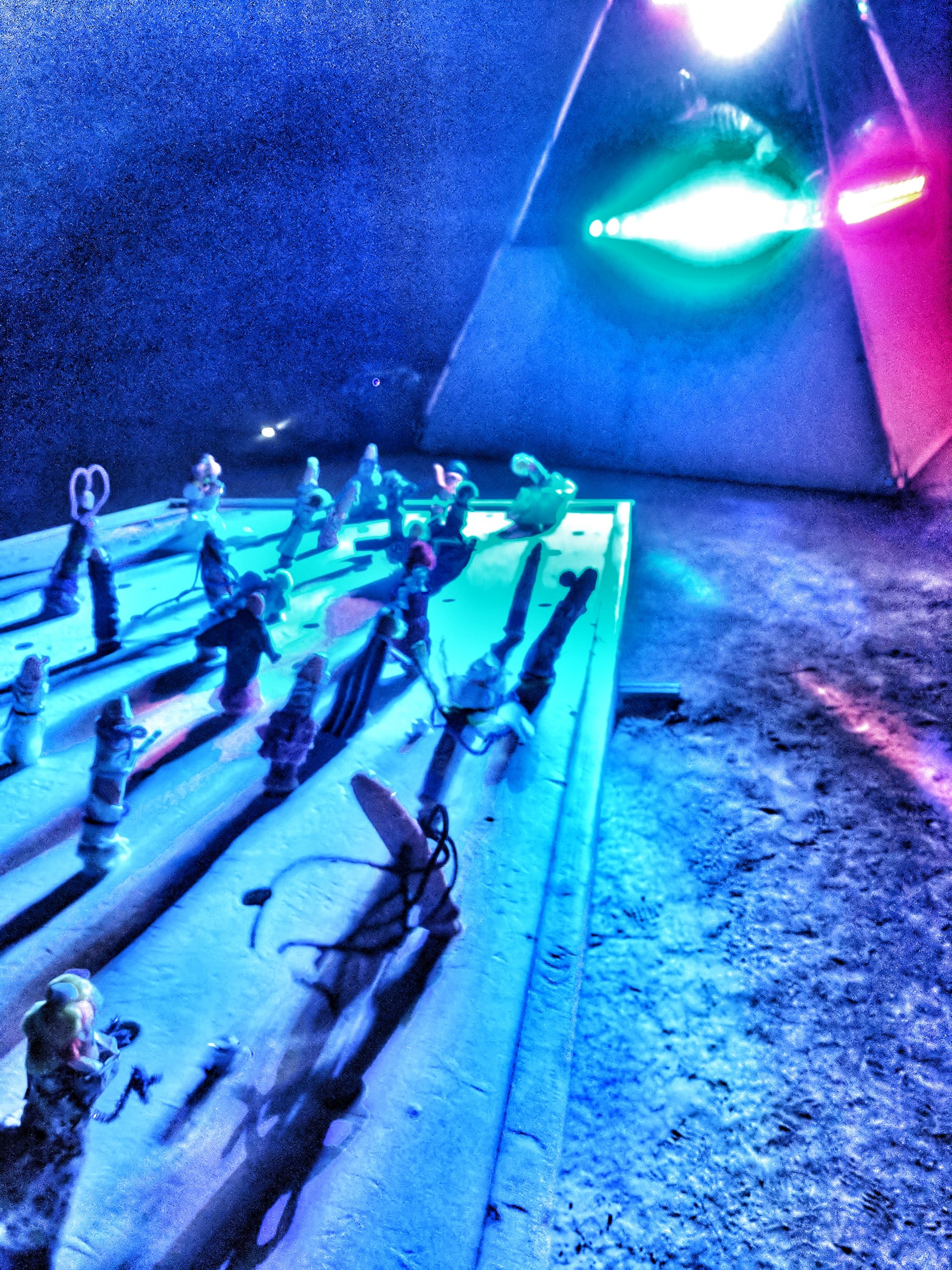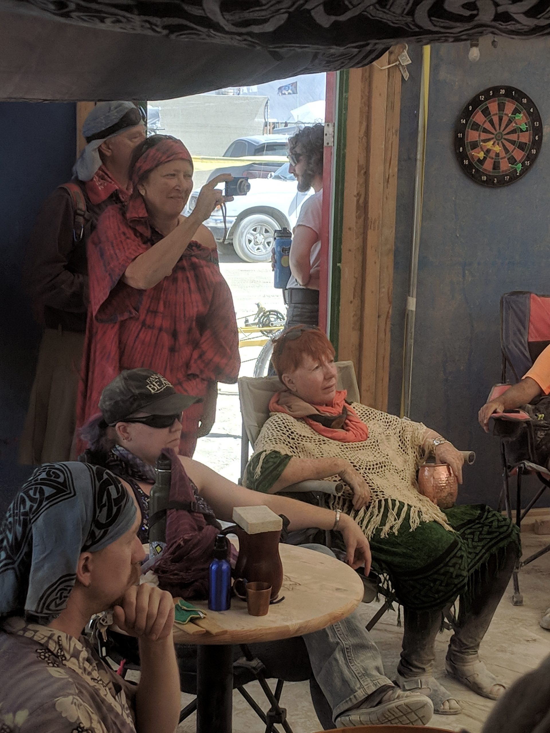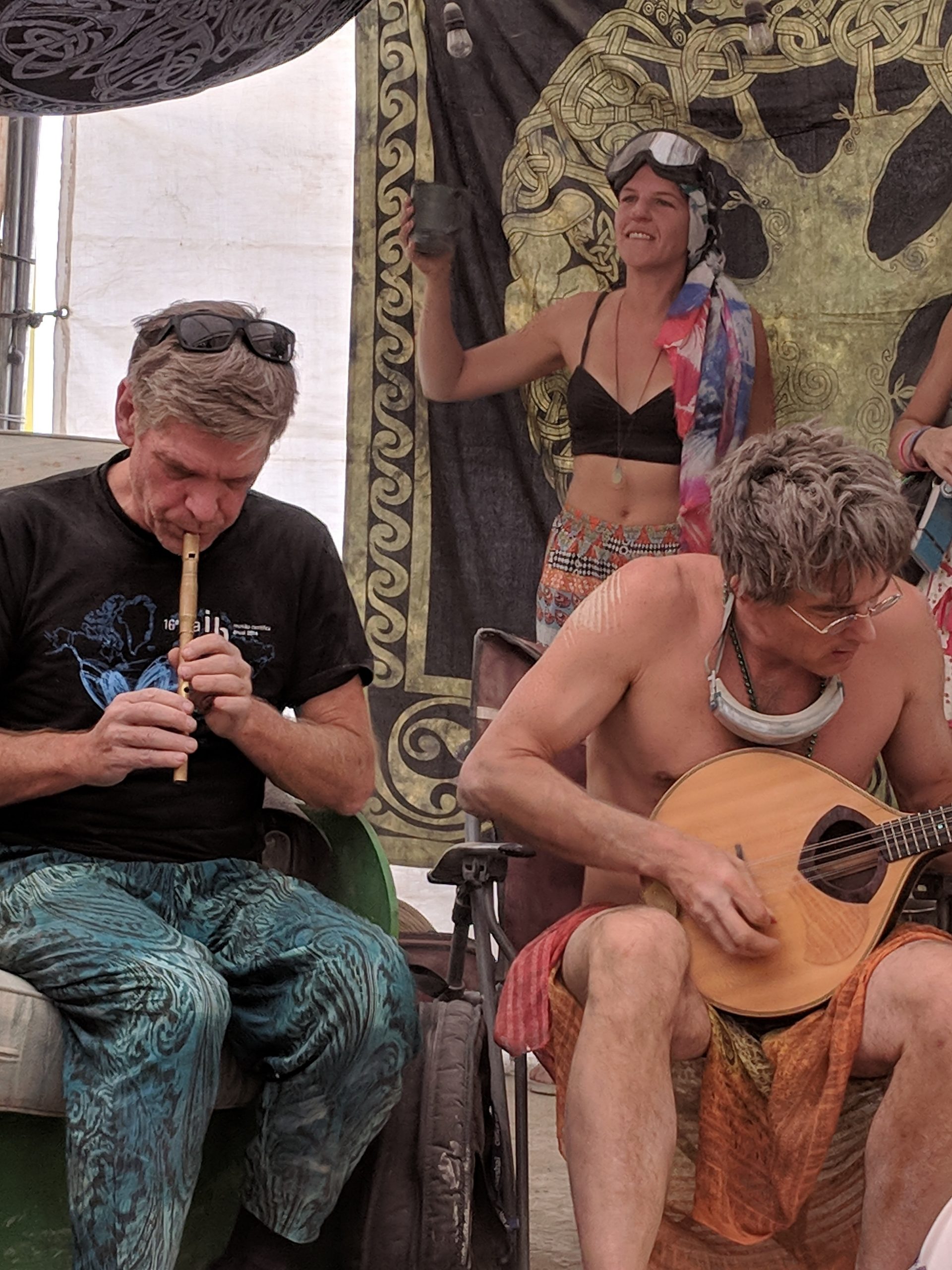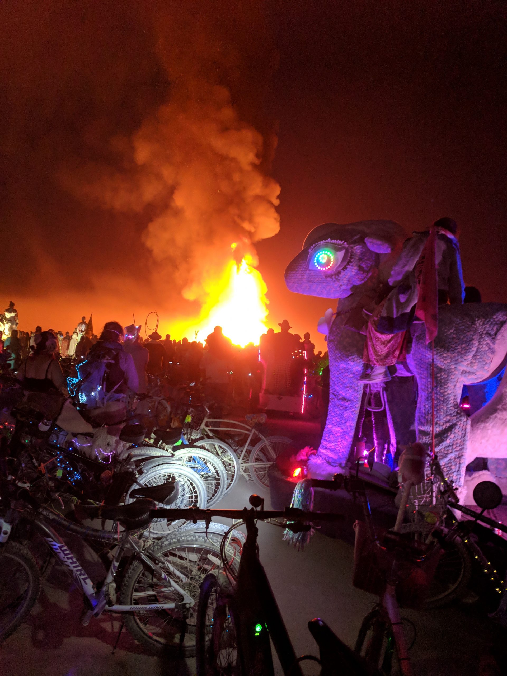 Thursday was usually my crash day but I had already got that out of the way so my day was opened up to doing something on my burner bucket list a bit to the opposite end of the spectrum. Instead of staying up all night to see the mythical sunrise, I woke up an hour before in order to have the experience sober and with (still a very small amount of) sleep. Biking out to the dimly-lit temple in the dark chill of that desert night, I walked around looking at the hand-written letters and other tributes hung in the structure that were often made out to recently deceased loved ones (the doggo ones got me the most), observed the people in there and checked in with what was happening to me at that moment in the most spiritual place of my universe. Outside was more musicians playing impromptu, this time in the style of soft singer-songwriter, and watched someone dressed as a Chinese Death Warrior walking around while stopping to stare at the rising sun. Biking farther into deep playa in a semi-agro-semi-curious search of the sound camp that had been shaking the entire city during all hours, I stopped first when stumbling upon a sunrise wedding and then continued on, finding it with what looked like spaceships outside and a kind of meditative chanting session beginning inside. From there I headed back to camp for the attempt of a nap, stopping along the way to check out the man and other art. Later was the Swan’s music session where I experienced one of the most impactful moments for the year when watching a woman who appeared to be from Ireland or Scotland and was emotionally being reminded of some kind of big memory. It was fun to be able to be in the middle of the music instead of staring at the backs of others while bartending but it wasn’t so fun to bust out about half way through with an allergic reaction to all the dust that was being kicked up directly into my face thanks to the rugs of previous years being MIA during the obligatory jig-dancing and stomping with the music. Que a Benadryl daze and the third of the four times my body went down.