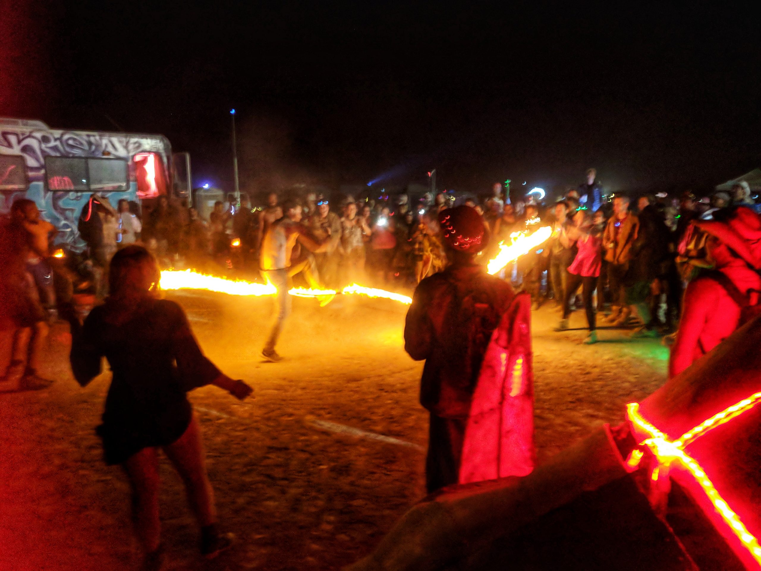 On what I’m not sure was that night or one of the two surrounding, I grouchily hoofed it to Go the Fuck to Sleep, Aaron and Brigit’s camp, after letting someone talk me into a different camp visit that made me miss an art-car ride that I had tried to chase down five minutes too late. Thanks to a flat tire on my bike, personal transportation had been grounded for the evening, leaving me on foot. Once making it and after hanging for a bit, our old pal Moose joined us in the special state we had opted to participate in for a designated night of playa wander. What itty-bitty-teenie-weenie little bit of it we could cover before our feet and backs started to hurt at least. We even managed to find some square dancing that Moose and I participated in (while Aaron grumbled) and live Bluegrass. Hurray for some of my kind of music/NOT EDM! A couple nights later was the grand finale. Hopping on an art car that was a magic carpet to make our way out for the burning of the man, that huge and epic celebration full of lights and fire, it for some reason took on my spiritual highlight for the week. Even above the temple burn. When that happened the next night, after being pleasantly surprised by running into a woman also camping with us whom I had had a special relationship with years before when meeting at the event in 2013 that had first introduced me to the burn, I managed to hop onto a different art car that was a bar. As I still wasn’t fully recovered from heat exhaustion I got earlier in the day, not being fully there in head or spirit could explain why the man burning had more of an emotional impact for the year. As was customary, I had made it to the Orgy Dome (don’t be a prude) after the man burned the night before with a great fella from my camp and a lovely couple from the UK who I had met at glow-in-the-dark body painting and hung with a couple times since. The problem was that we hadn’t made it there until the wee hours and had stayed until almost dawn before starting to break down camp just a couple hours after finally making it to bed. So yeah. Cue heat exhaustion. The grand finale of my body rebelling against such harsh conditions right after India. Raking the dust to check for moop out there in the blazing sun where our large camp had been set up, I had eventually gotten dizzy and out of it enough to find a camp that was offering different flavor teas and set up to chill, as the one with misters I loved so much had already been broken down. Not feeling much recovery until the sun went down and even after the temple burn, I was still at half-mast for the last night’s epic party at what was left of Spanky’s. A great time complete with jump ropes of fire, I did manage to stay out long enough to want to be there as an end to my annual time on the playa for years to come.