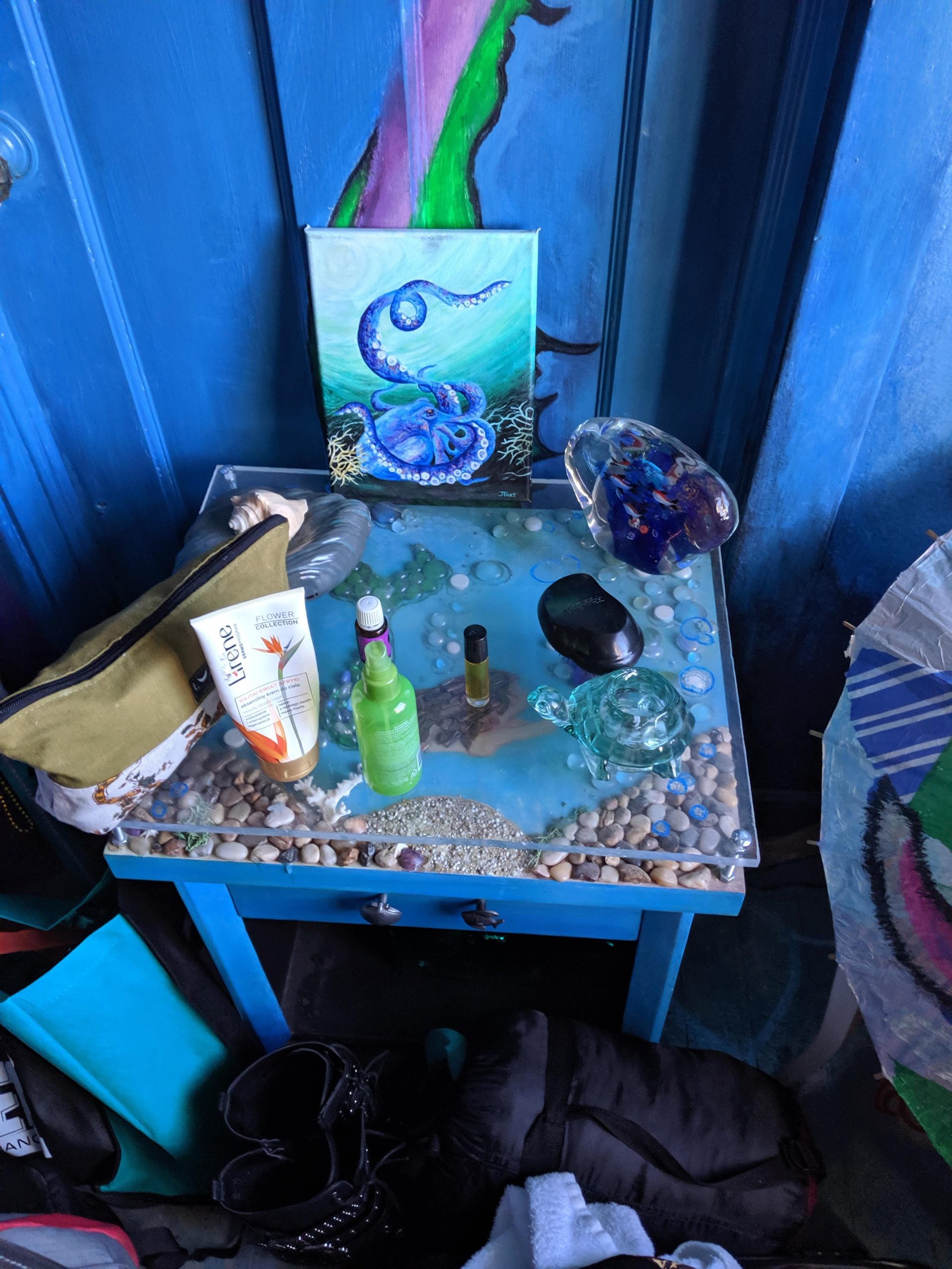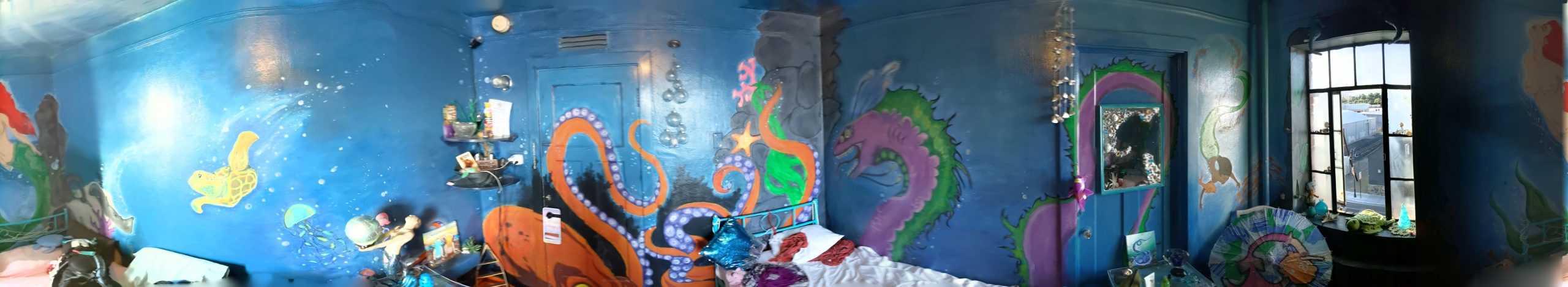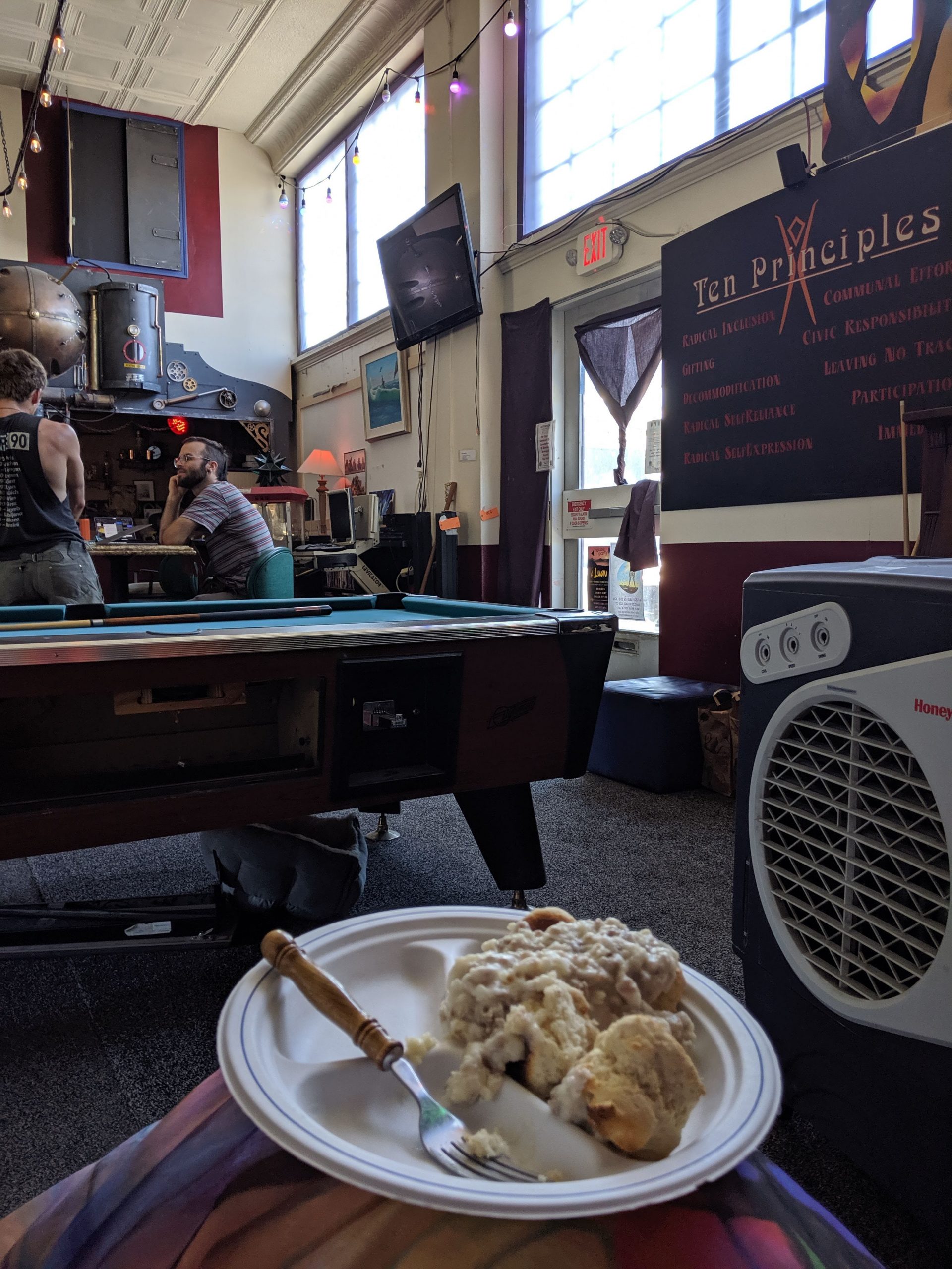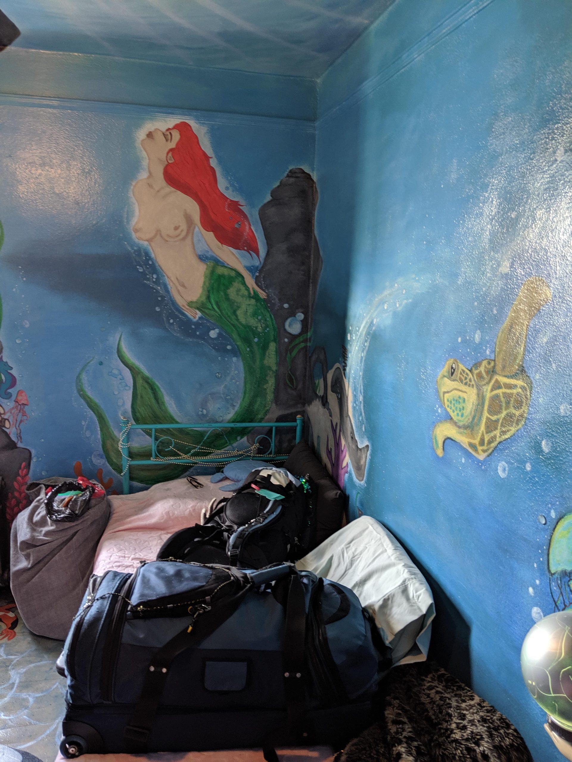 AUG 22ND – THURSDAY Flying to Reno as opposed to road-tripping proved itself to do the opposite of it’s original intent by being way more work than driving. Mostly because of the chaos of setting up extra rideshares. One for my stuff from and to San Diego, one to get me onto the playa from Reno, another to get be back to GSR in Reno and then one for me from the airport in SD to Jewels’ pad for house/dog-sitting. For my stuff, I managed to find someone somewhat quickly through a local burner page on Facebook. The connection was strained from the beginning, though, as it seemed hard for him to grasp that he would only be taking my stuff, not me. I in turn got confused about what I must be missing that made it so hard to understand and where I was failing to communicate clearly. It was a pretty clear flag for how things were to go down (as if I needed help in the hot-mess department) but I had such a long laundry list of stuff to take care of, I let it go. At least joining a burner cocktail hour at his house the week before takeoff made me feel confident that he was an upstanding guy. Upstanding in intention but still not good with coordination or how much he took on. By the time we were all to leave, he had committed to taking stuff for way too many people (for a fee) making the whole thing even more of a mess. Among other things, he hadn’t realized he would be taking my perishables and I had failed at packing the cooler with enough ice for that food to make it the two days to the playa. In no small part because it was only supposed to take one. He had decided last minute to go a day later and hadn’t thought it a big deal to clear it with all of us. Doing my best to hold back panic with reminders that things going awry was the way of both the burn and travel, two main focuses in my life, we ended on the note of him putting in an extra bag of ice on his way and me lugging the heavy tent with me. Part of the reason I was going by plane was already out the window but the main goal had actually been to get some sleep before getting onto the playa. I still had a shot there. A shot that was also to end up missing the mark thanks to anticipation-induced insomnia and a roomie who thought bringing a guy back to hookup with was a good idea. That part was fine, actually. What wasn’t was for both of them to be constantly opening and shutting the door all night for god knows what reason. Before that lovely grand finale of the trek, though, and after dealing with the headache of figuring out my stuff, I had gotten to the airport only to find out that the flight had been delayed. I could only laugh about that though I could have strangled the dude sitting by me in the airport as he loudly chomped away on his food and talked at full volume on his phone. Finally getting to the Morris Burner Hostel in Reno and still having some time in the afternoon, I managed to turn my frown upside down when walking right into being able to show off my knowledge of the 10 Principals for a discount followed by being offered homemade biscuits and gravy. I also lucked out in being assigned to a very cool mermaid room. Forcing myself to not let an exhausting rough start make me miss out on too much after check-in, I even managed to make it to the thrift store across the street in that uninviting industrial neighborhood followed by checking out the grounds of the actual hostel. There was art all over the place along with the varied themed rooms I had checked out earlier. Meeting a new humpty-hump door-squeaking roomie when dropping my stuff, a sweet gal from overseas who had never been to the burn, I had been excited for her being a virgin and a little worried on her behalf that she was going to tire herself by going out to meet up with friends before hitting the harsh desert. Those feelings of excitement and care were replaced with agitation, however, once her and the dude she brought back were in and out, in and out, in and out. Man. I just couldn’t catch a break.