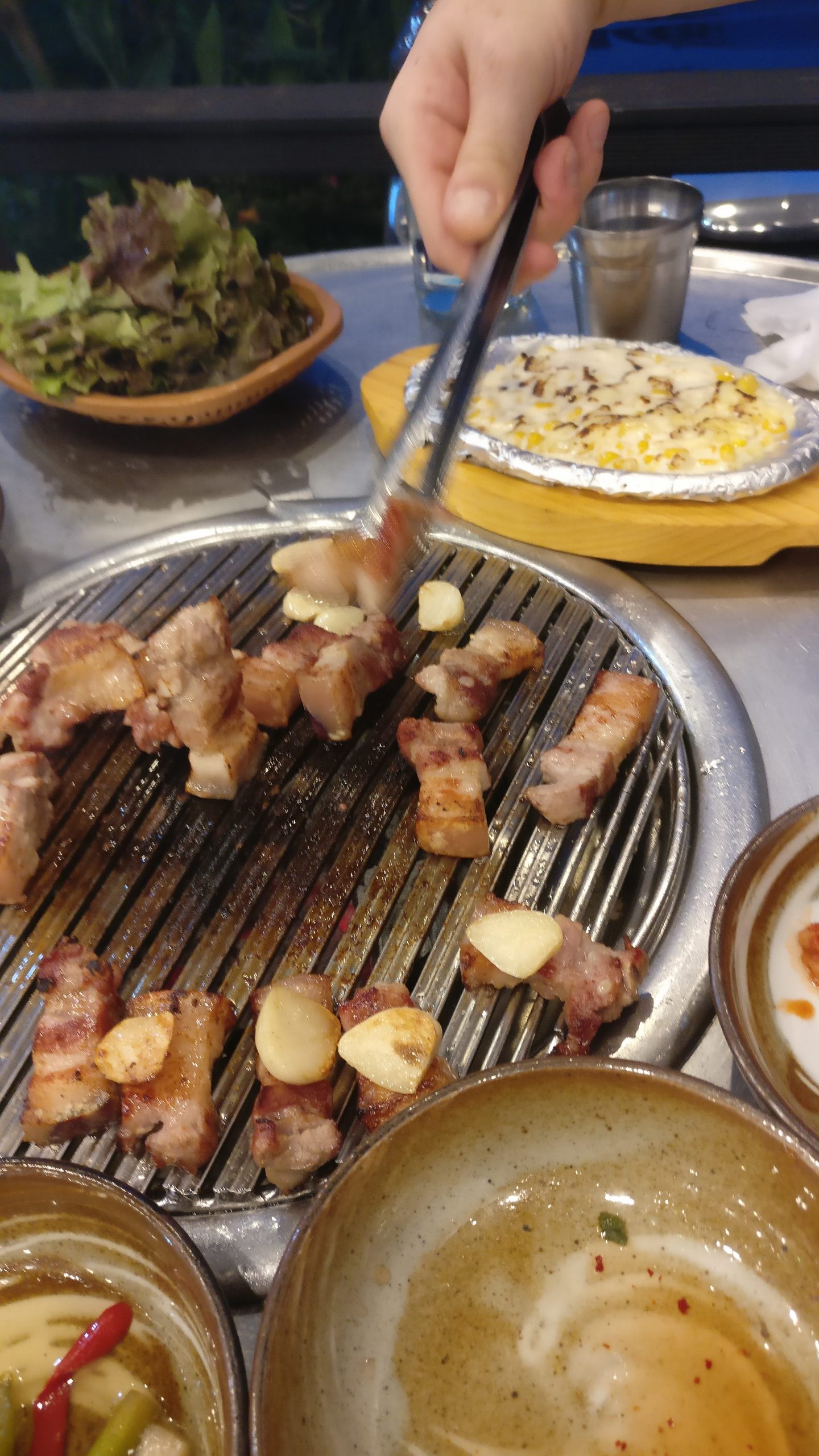 Saying our goodbyes, we made our way to a guest house I had booked (same thing as a hostel) called Gudeok (구덕게스트하우스). Way more my flavor than the hotel, I adored how many personal and creative touches there were. It was a small business owned by real people and I could feel the life of those who had stayed there before. The owner even pointed us in the direction of our highlight for the evening when referring us to a yummy Korean BBQ spot for dinner. Stumbling upon an entertaining surprise while trying to find it, one of the short barrier walls on the street showcased some R rated art that we were enjoying until realizing that he had indeed been following us (as we suspected) from across the street to make sure we could find it. Good thing as we had walked right past.