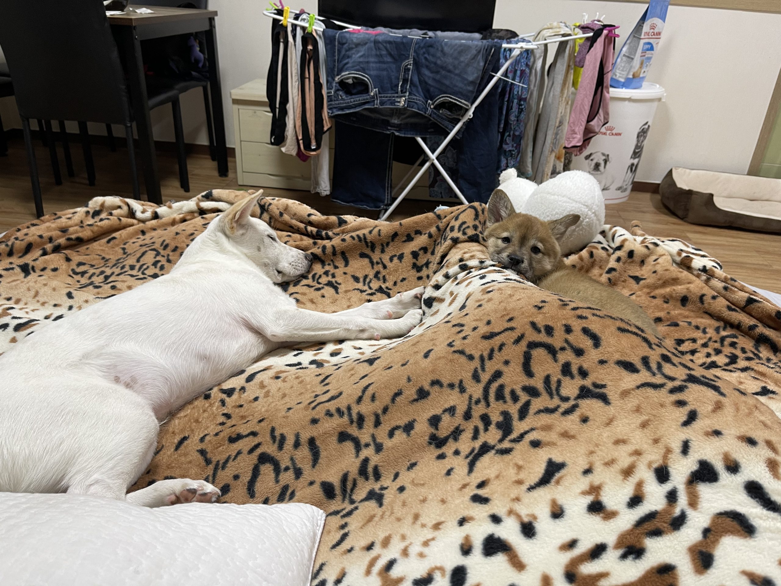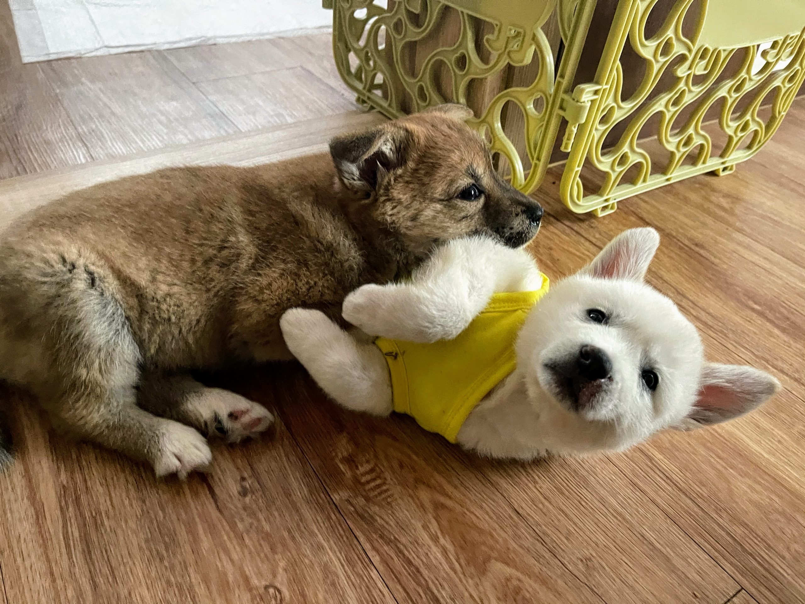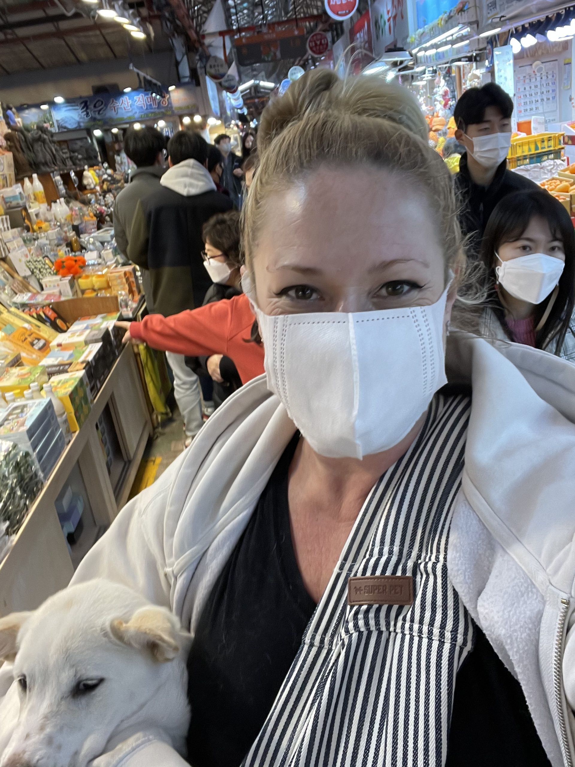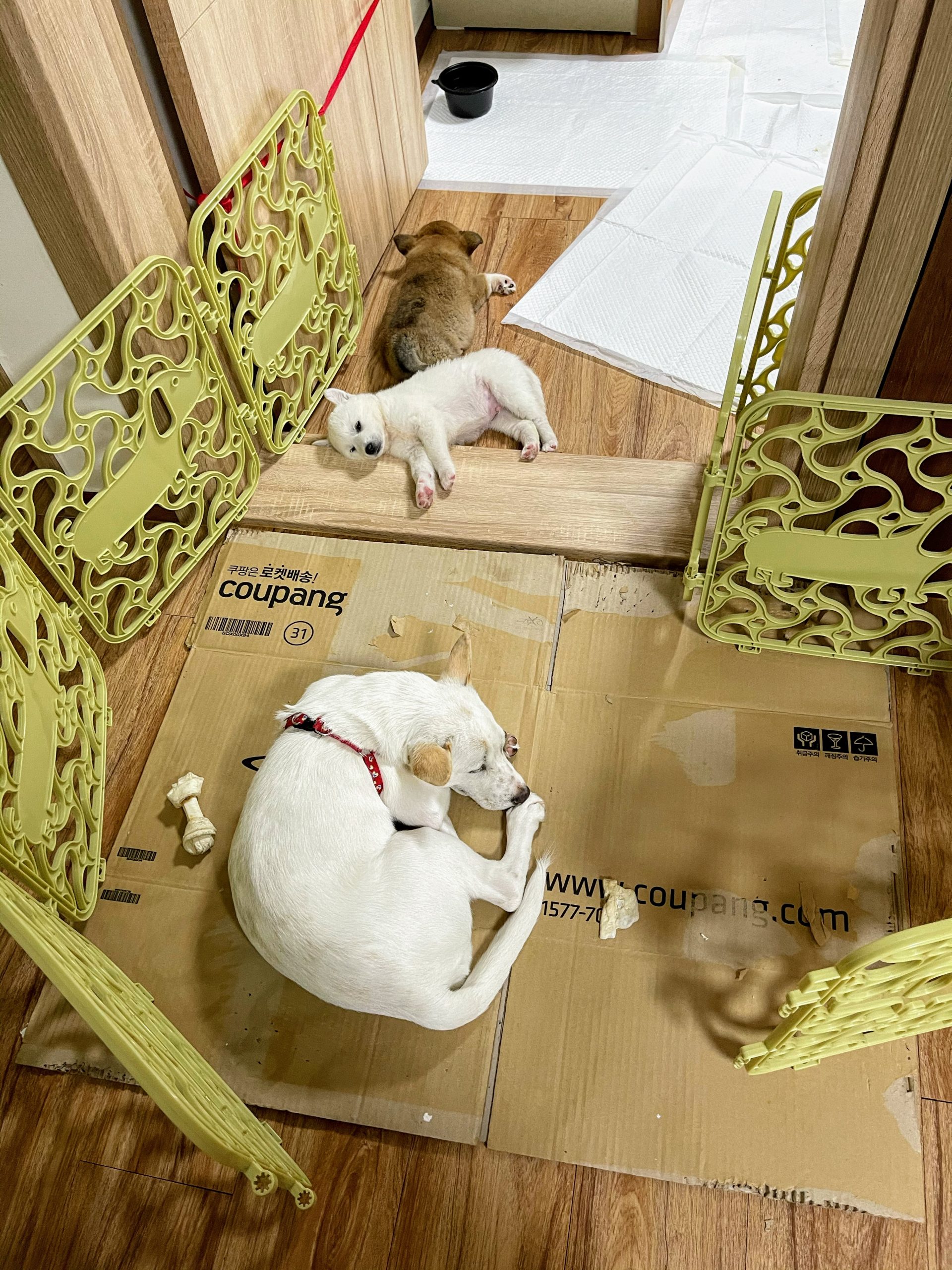 The new hooman parents of Boo (formerly Latte) and Jeju (formerly Pumpkin) were wonderful about sending updates and pictures. It was hurting missing those boys so I hung on every one. Even though it helped finding solace in Soju, they had been the first fosters with me long enough to grow through the phrases of being babies and into teens. I wouldn’t have a chance to keep missing them too much for long, though. Regardless of already being pupped-up, Eun Suk suckered me into taking in two more tiny pups. A brother and a sister. The brother was smaller, gentle and it would turn out had ringworm. The sister was a destructive troublemaker. I didn’t need to be too involved with Saja, though, as was doing great in his new foster home. Thank goodness the woman who was taking care of him had a balcony he could come and go on at his leisure, as he continued to be more of an outdoor dog who didn’t really like being inside. On top of the three with me, Eun Suk also wanted me to take in another litter of five. Three ended up dying from the Parvo they caught in the “shelter” before I could, though. It all was a lot and boy was I grateful for any help I could get. When an expat named Stacie came over to volunteer with taking Soju out for a walk while I was at work, I was grateful. Later her and her boyfriend (who would eventually become my colleague) would even donate a bunch of toys. Things were growing fast and it was welcomed help.