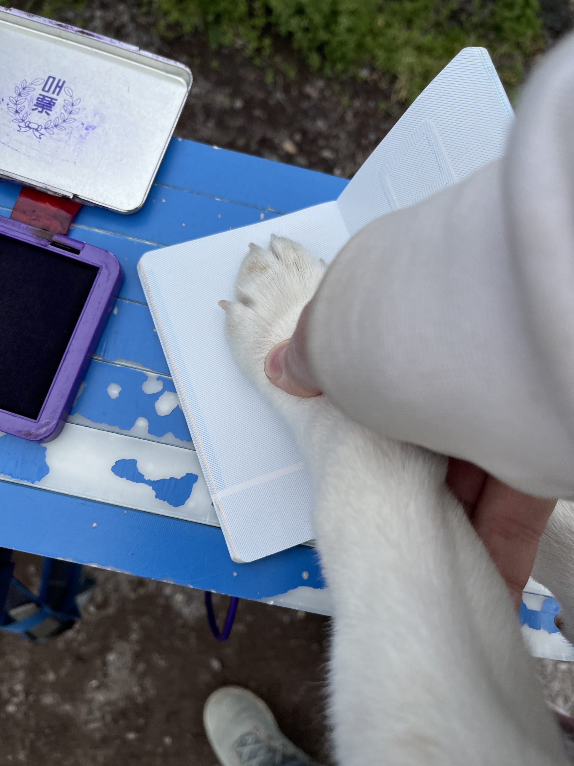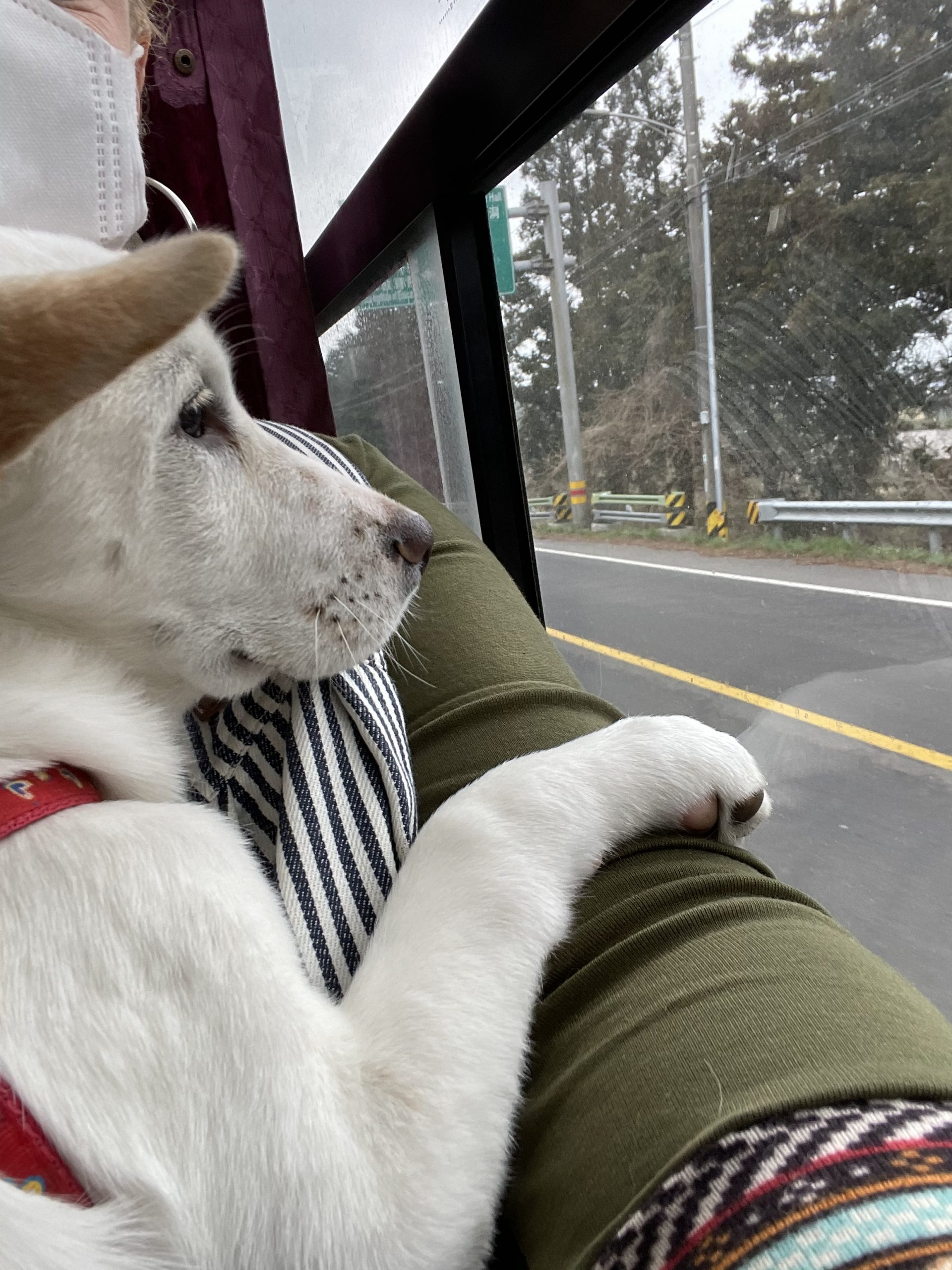 After those two love bugs had moved onto their new adoptive families, it was wonderful to take in such a great pup as my next foster who had been temporarily named. His being super sweet made my heart ache just a little less when having to say goodbye to the first two. His being such a hit everywhere made it even more fun. Besides his name cracking everyone up, he just loved people. He was even allowed in my favorite local restaurant of the moment, both the wine bar and coffee shop across from me and a super comfy-cute log cabin style restaurant called Deer Lodge that served both beef stew served when a bell was rang and Irish coffees. He came in taxis, on a long bus rides and even got his paw signature stamped into my Olle hiking passport when we did a trail together.