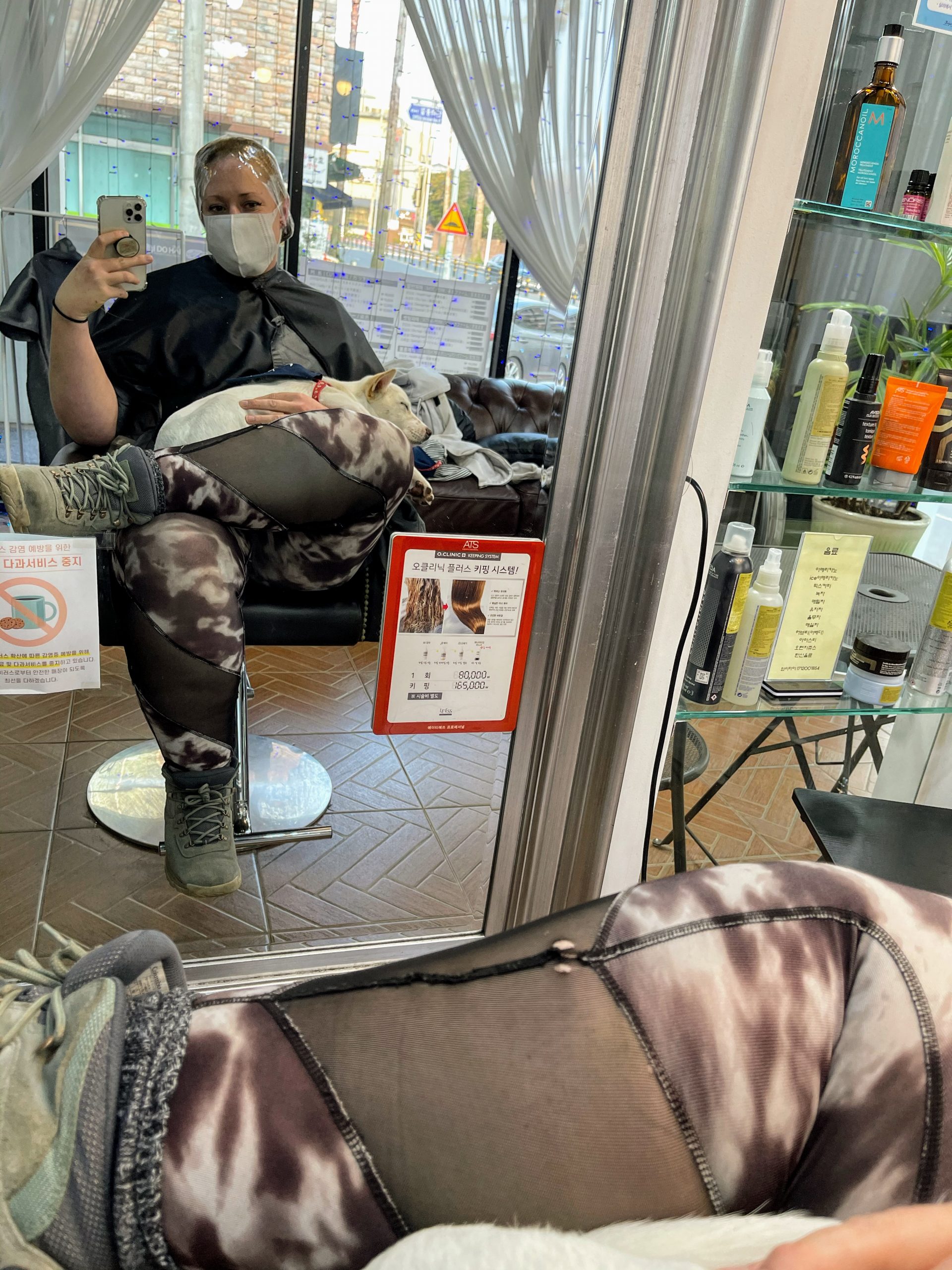 The real splurge for the month was getting a bazillion blowout done on my hair. It was painfully expensive (something like 230,000₩) but it was nice to not feel like such a frizzy tangle-haired hippy. I had mixed feelings, of course, because of the saddening underlying knowledge that I was also doing it for better treatment and doors being opened if others thought I was more attractive. It never stopped being painful that so much value was put on that. It was also something I had always put extra work into (when I wasn’t rebelling) in an effort to balance out the prejudice of my being the worst thing a woman could be. Big. *gasp* Still, it was a nice treat, and getting it done right after an Olle hike with Soju, I was comforted from the shadow of back-mind thoughts and the high cost by his making everyone there happy and cuddling up right on my lap for most of the time. Such a dang good boy.
